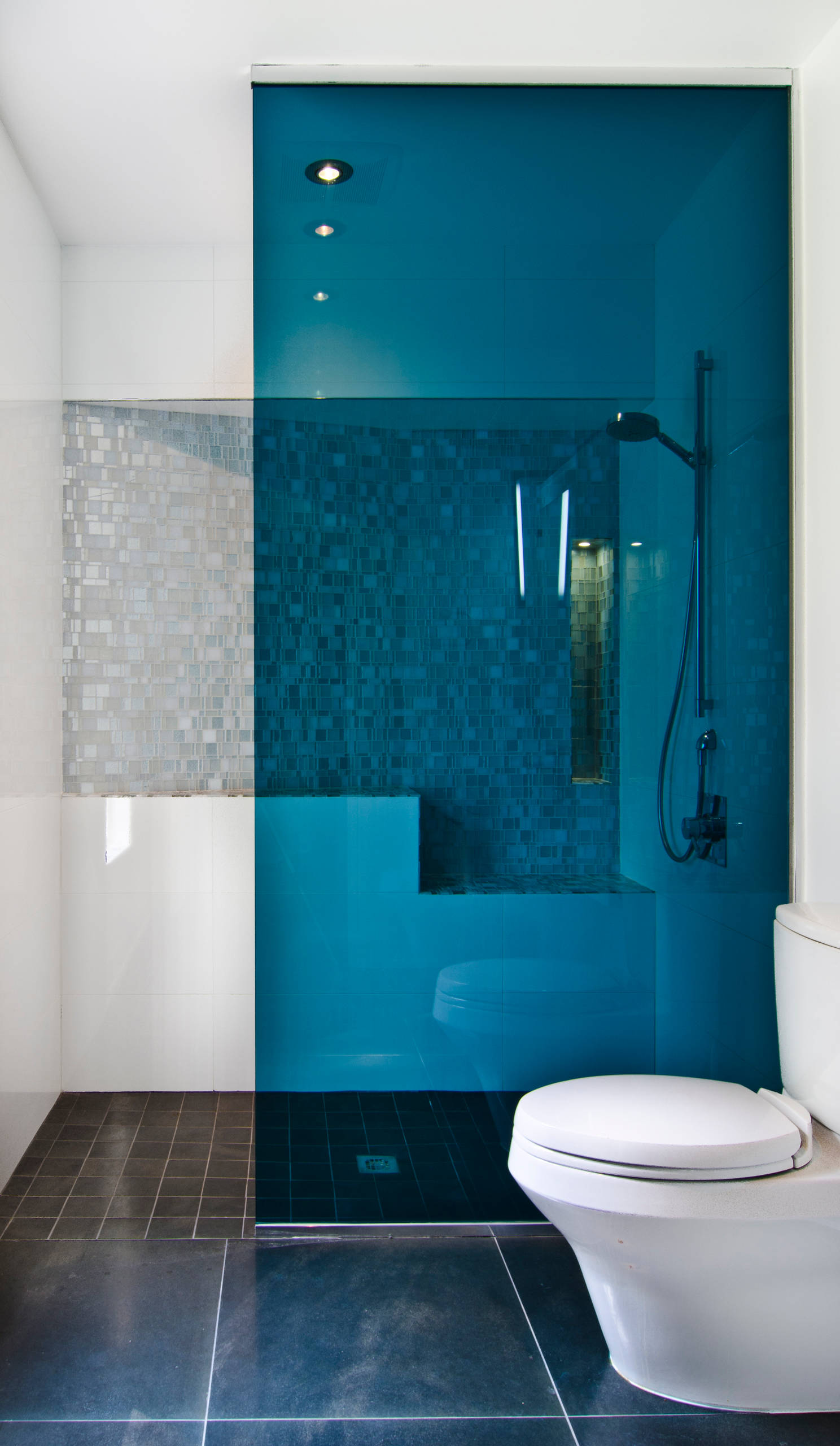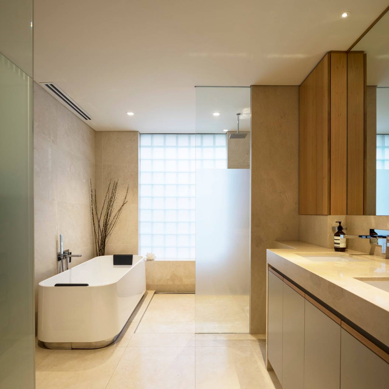 This bathroom has double-glazed switch glass to protect the space from UV rays as well as for increased privacy.