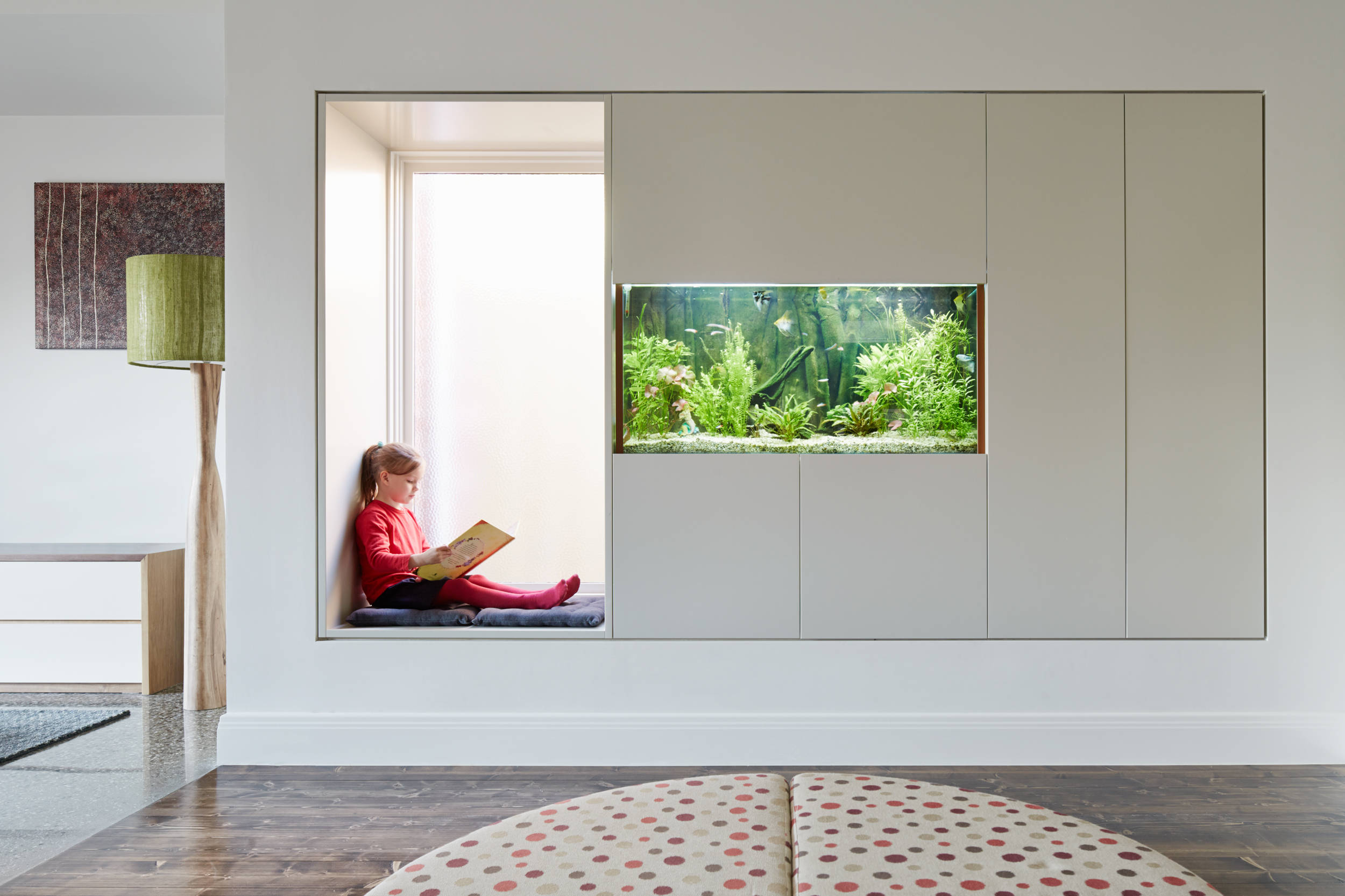 This rainbow of coloured film on this glass door not only provides a point of interest, but serves as a dramatic focal point, throwing a range of coloured light onto the surfaces like a modern version of a stained-glass window.