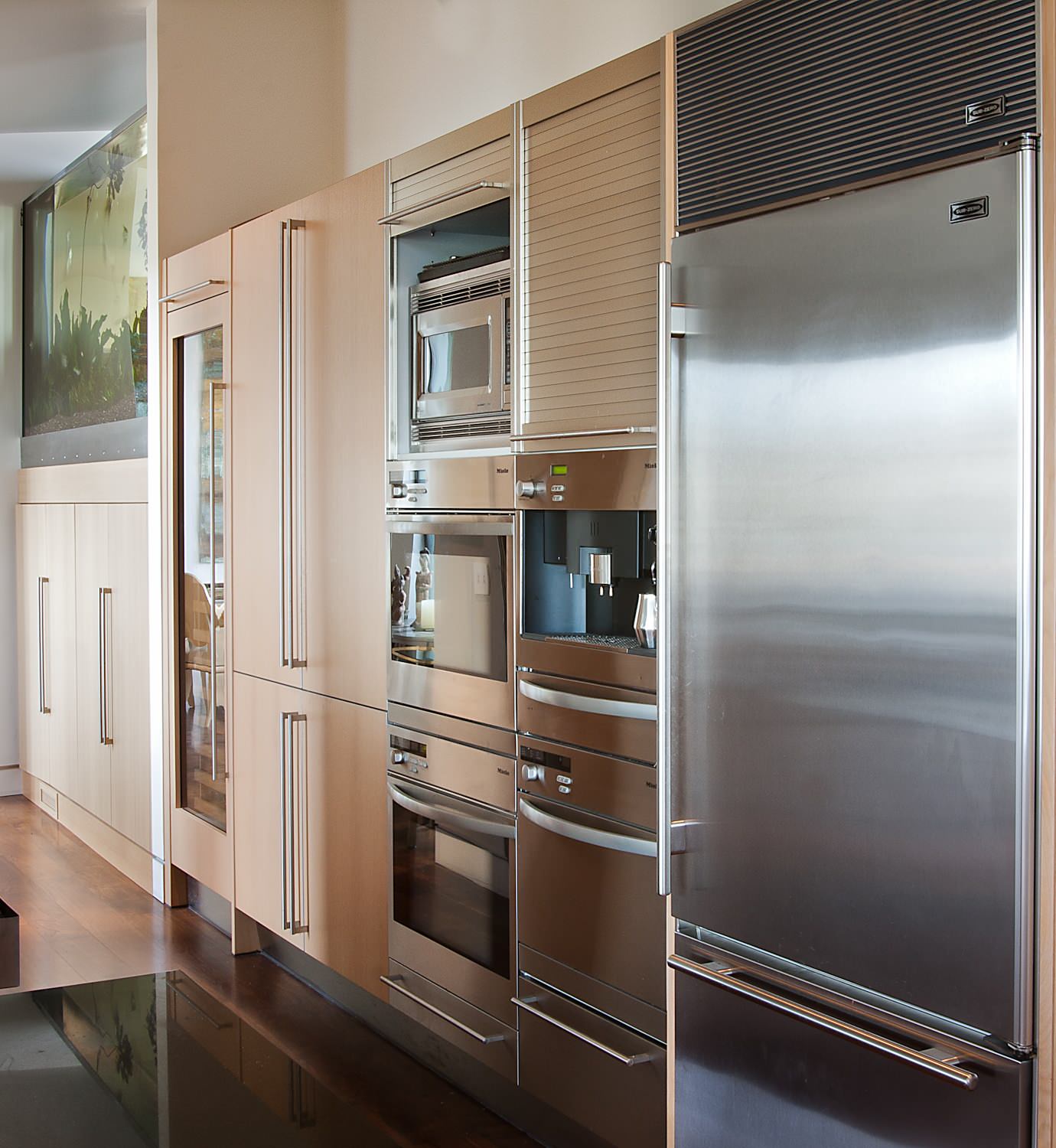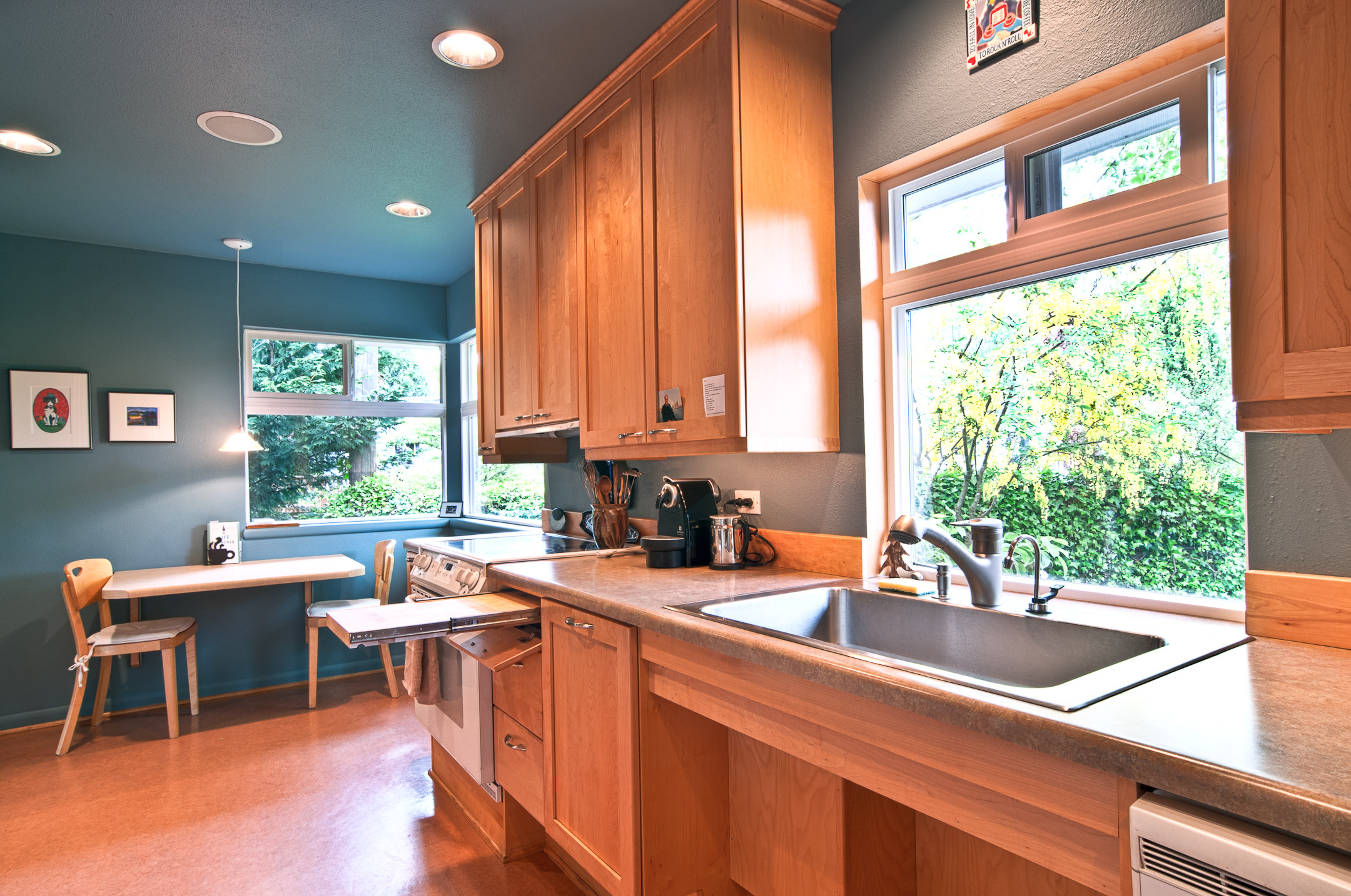 Embrace the principles of universal design to allow people of all ages and ability to use your kitchen conveniently. Apart from installing slip-resistant flooring and solid counter-tops, make sure the storage and counters are easily accessible. Modular design and built-in appliances support this kitchen with a modern flair. Open space beneath sink and stove, platforms at variable heights and low height overhead-cabinets make the kitchen even more user-friendly.