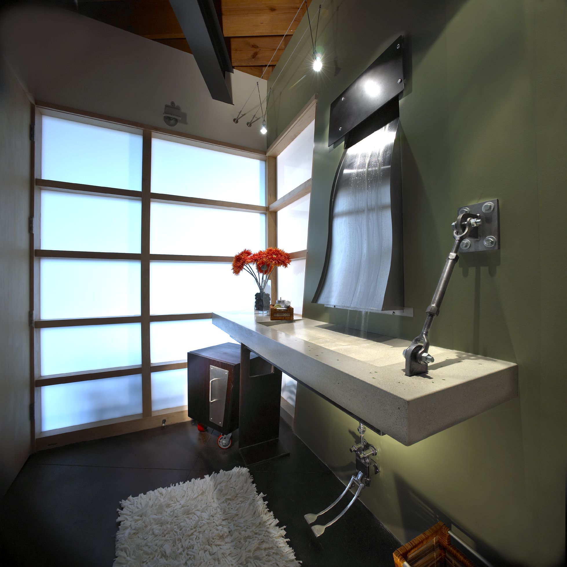 Fabulous, right? This trough sink is so elegant. The clean pattern of the tiles, the shallow sink, and the sliding ramp come together in this sophisticated piece. The stainless steel faucets and wall-size mirror complete the minimal look.
