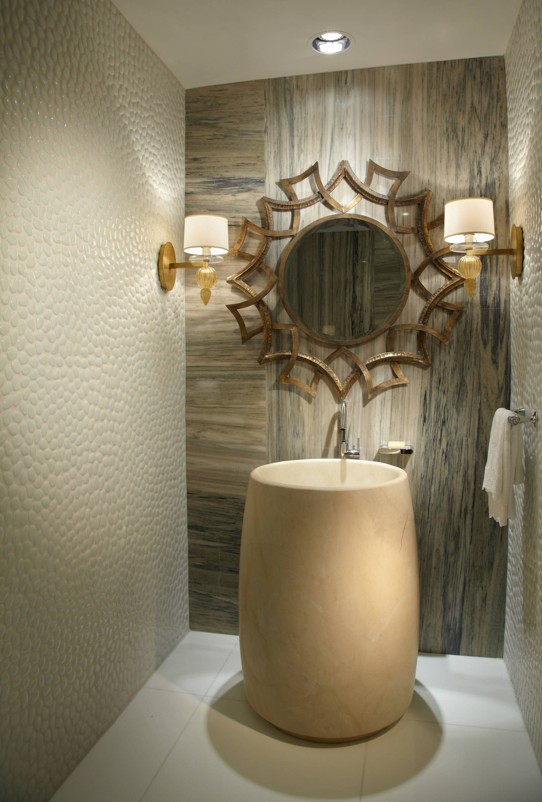 Here is a creative twist to the classic glass sink on top of the marble top. Hand-painted in layers of black, orange and gold, this sink brings in a very stylised look to the space.