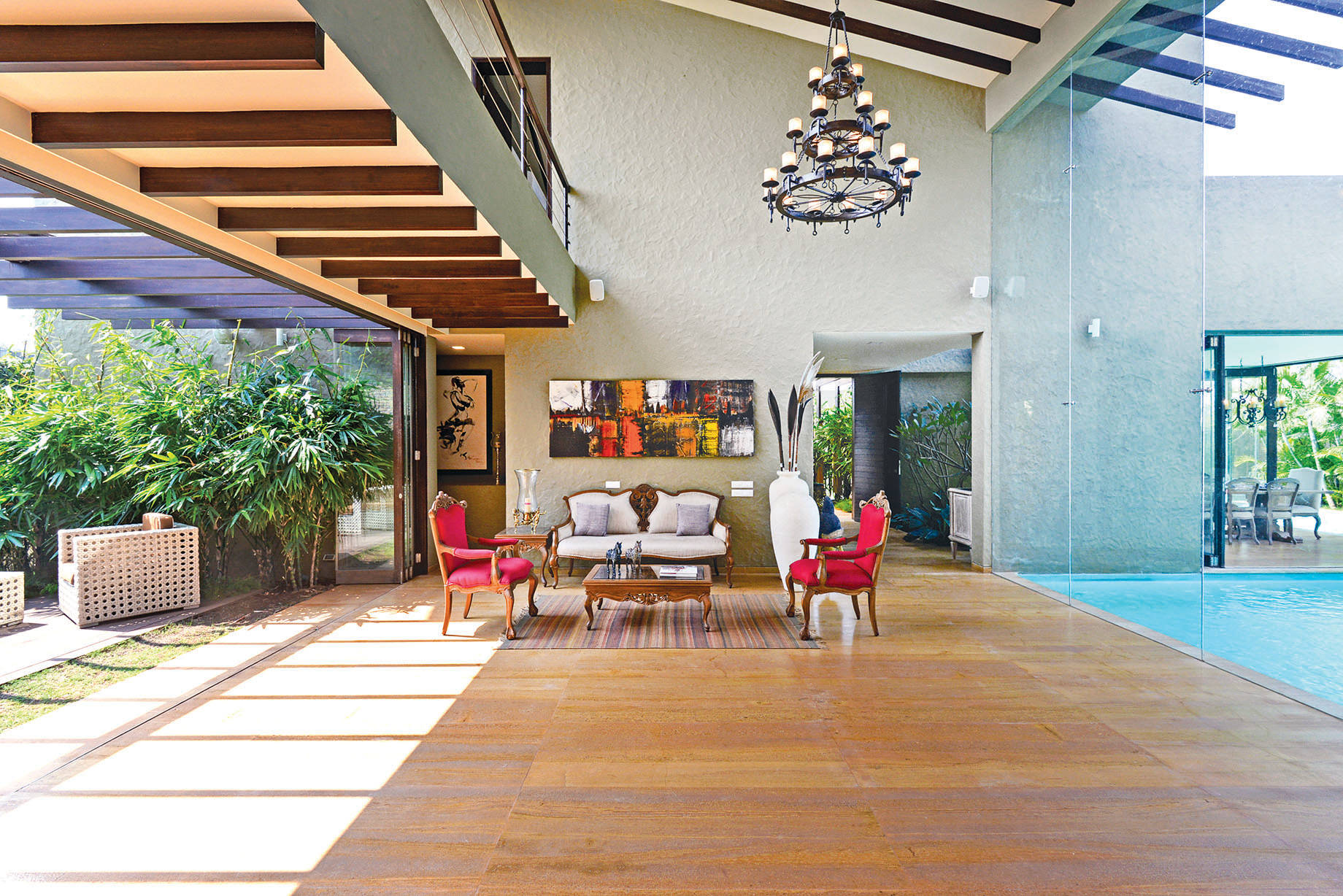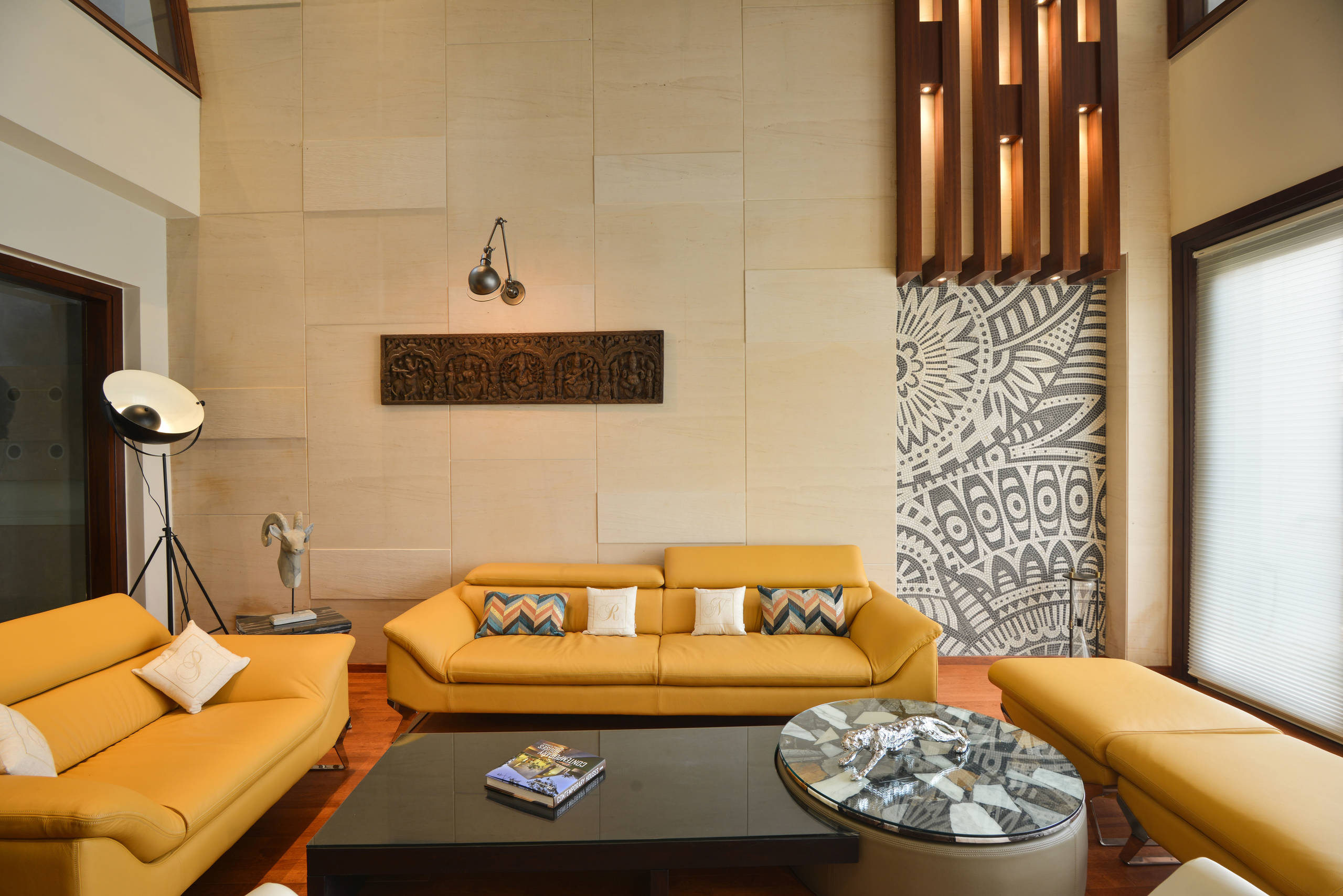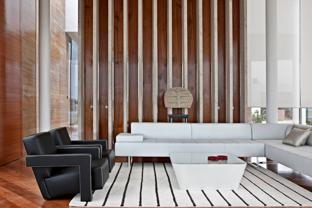 In this living room, the vertical wooden battens work as a stylish semi-open partition to demarcate the public zone from the private areas of the home. Note that the battens are on rails, so their spacing can be reduced to create a dense partition for more privacy or increased to retain a visual connect and create openness.