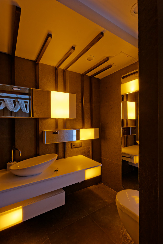 There is so much you can do with linear sections of wood. Fpr instance, in this powder room, wood battens of unequal sizes are installed on the wall and faux ceiling to form a dynamic piece of wall art.