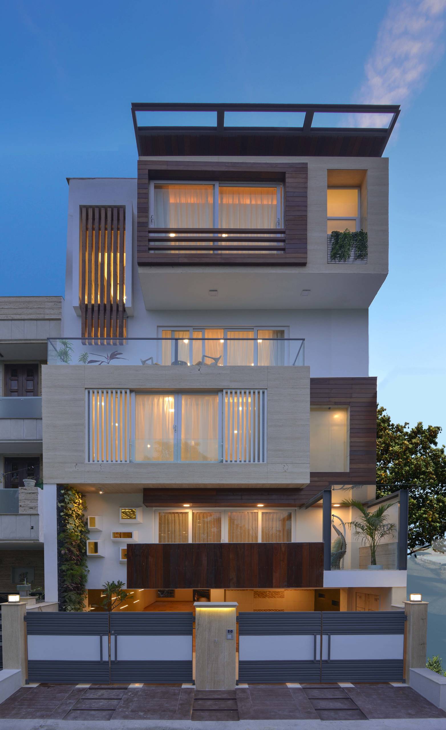 Here, slats are used on the external facade of the building. The vertical wooden slats impart a modern look to the exteriors and team up nicely with other facade elements like the wood and stone cladding, glass railings, huge windows and wall paint.