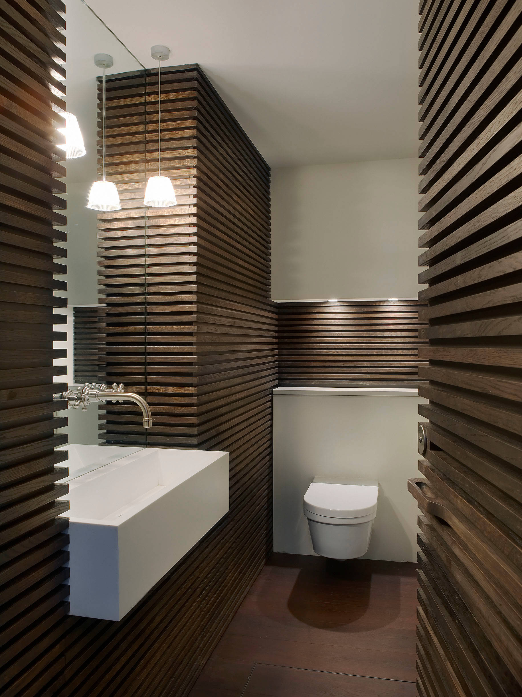 This contemporary powder room uses thin strips of matte-finish walnut wood to infuse a sense of luxury and create a rich textured effect. A similar colour is carried on to the floor tiles. Make sure that there is plenty of direct and indirect light to balance the darkness created by the wood.