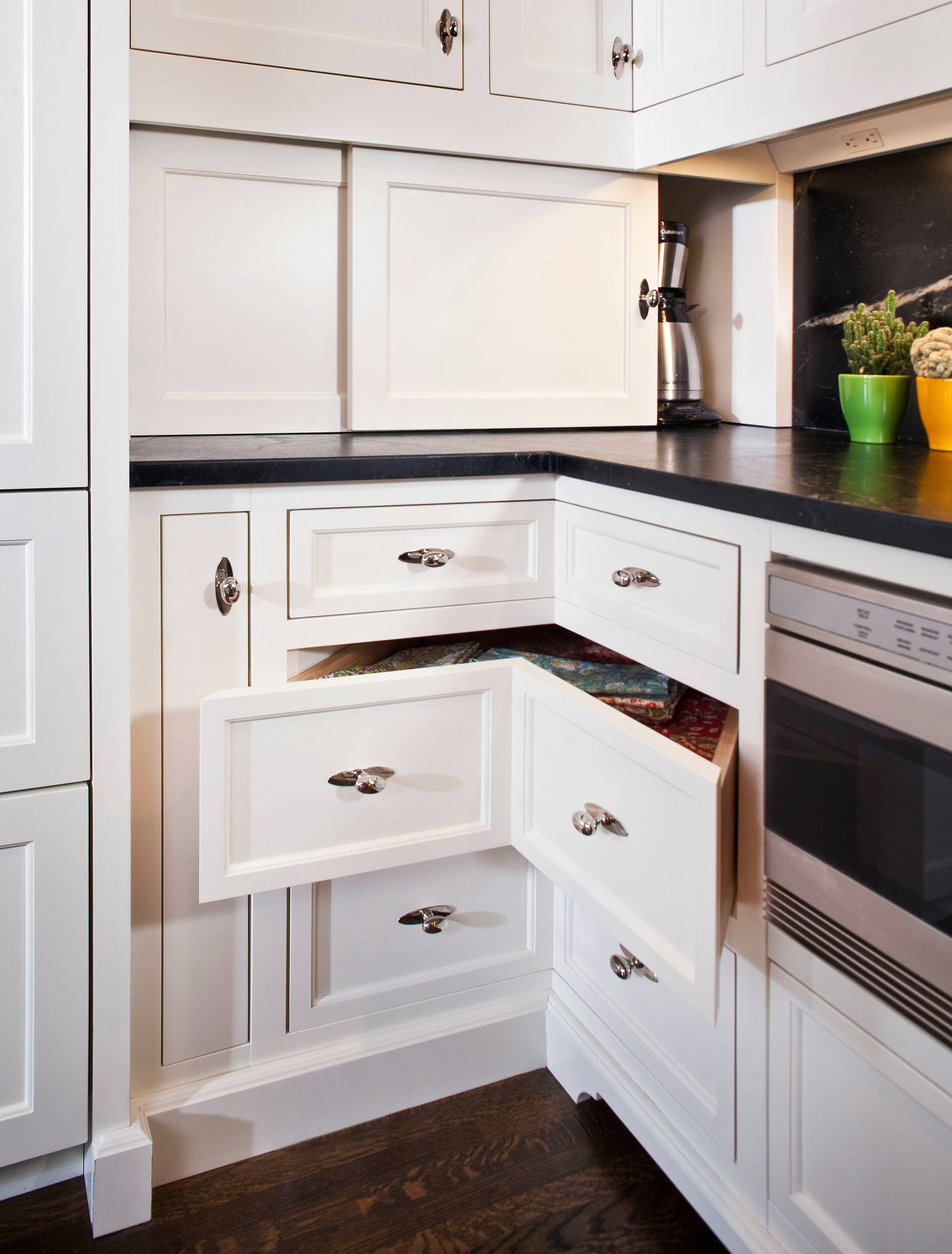 If you can’t avoid corner cabinets, then at least make them as functional and easy to use as possible with fully rotating lazy Susans or clever corner drawers.