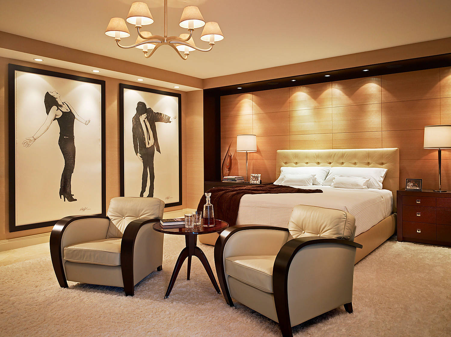A perfectly lit room has three basic layers: Overhead lighting, task lighting and accent lighting. This bedroom pulls all those together – the chandelier for overhead, bedside reading lamps as task lighting, and accent lights above the headboard and artwork.