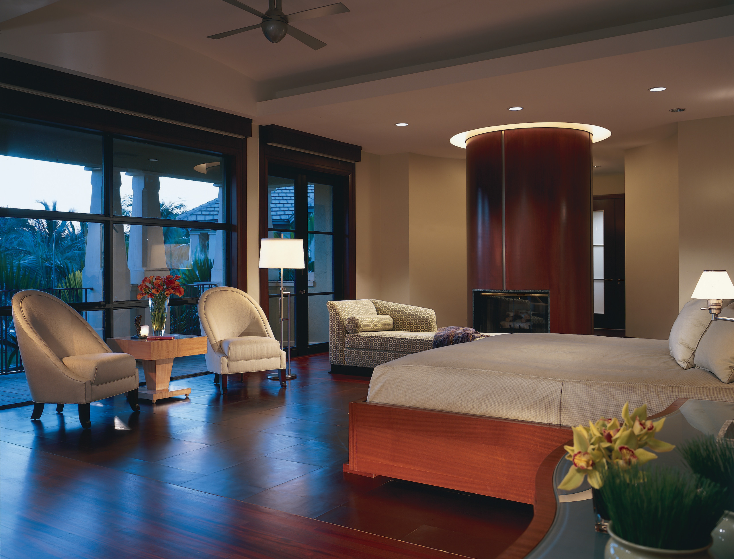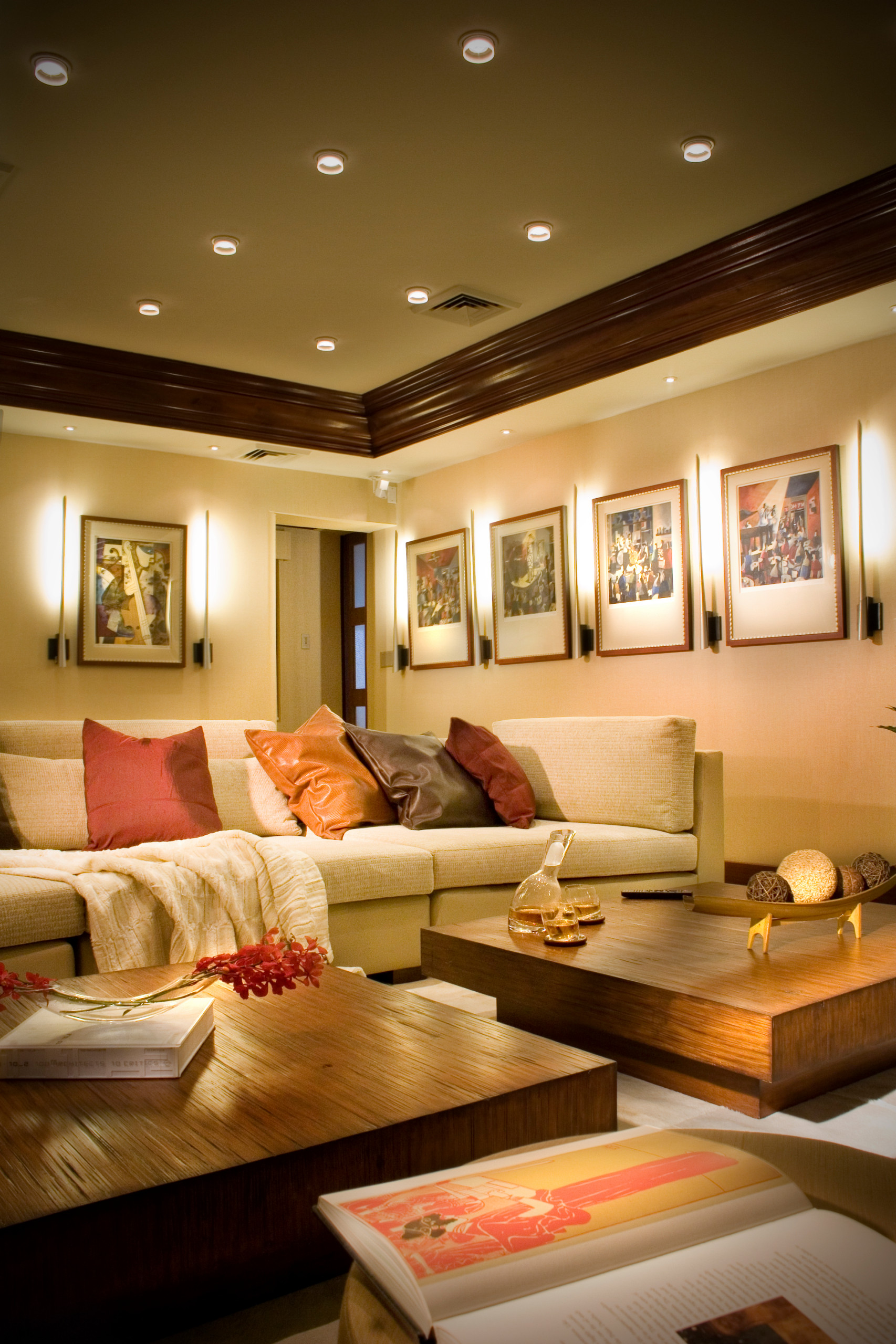 Look for opportunities to install light fixtures in alcoves, tray ceilings and wall niches to trace interesting lines. Notice the hidden lights in the ceiling alcove above the cylindrical feature here.