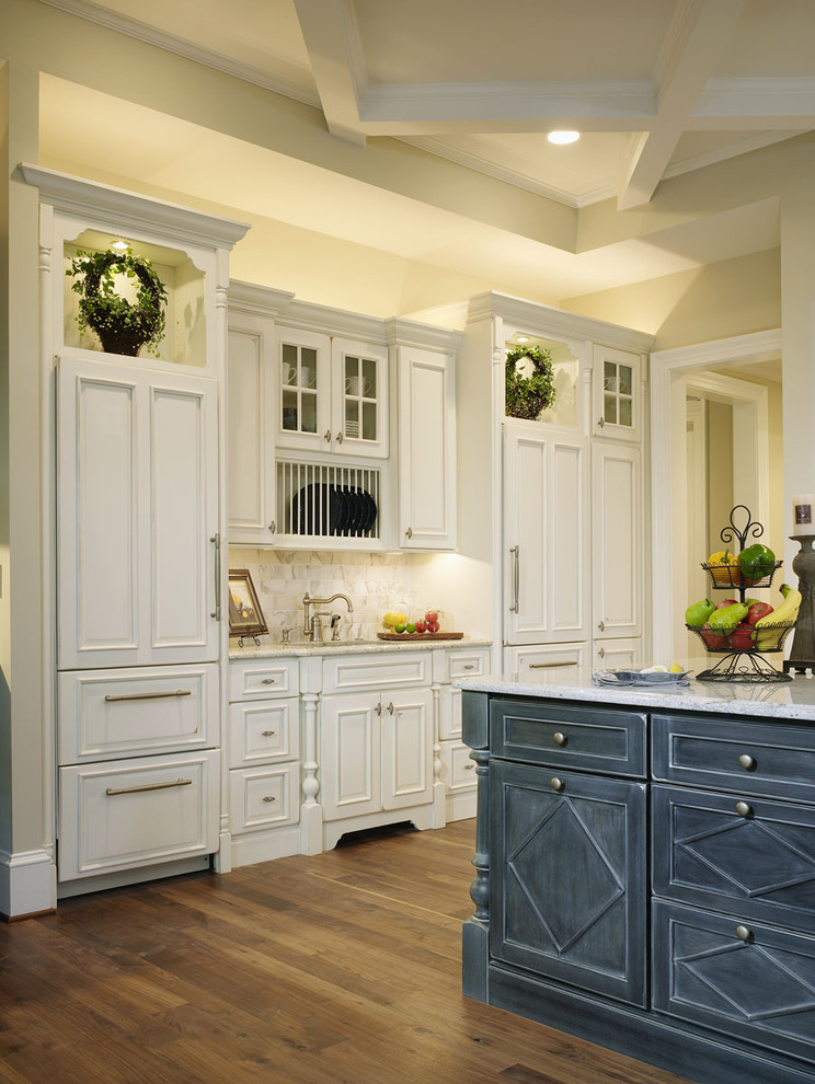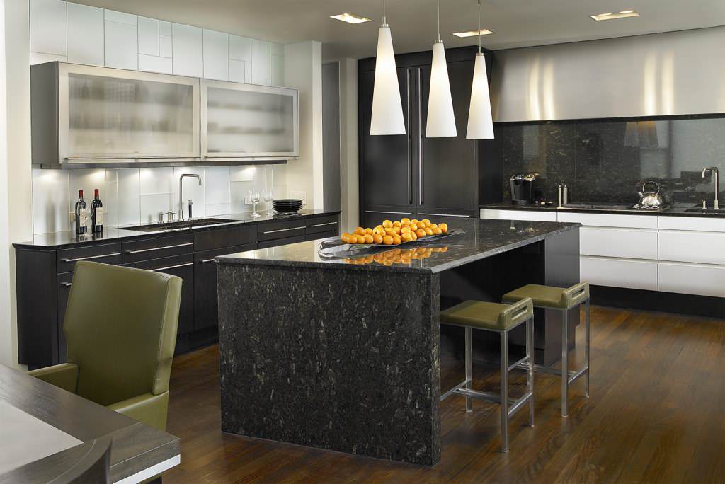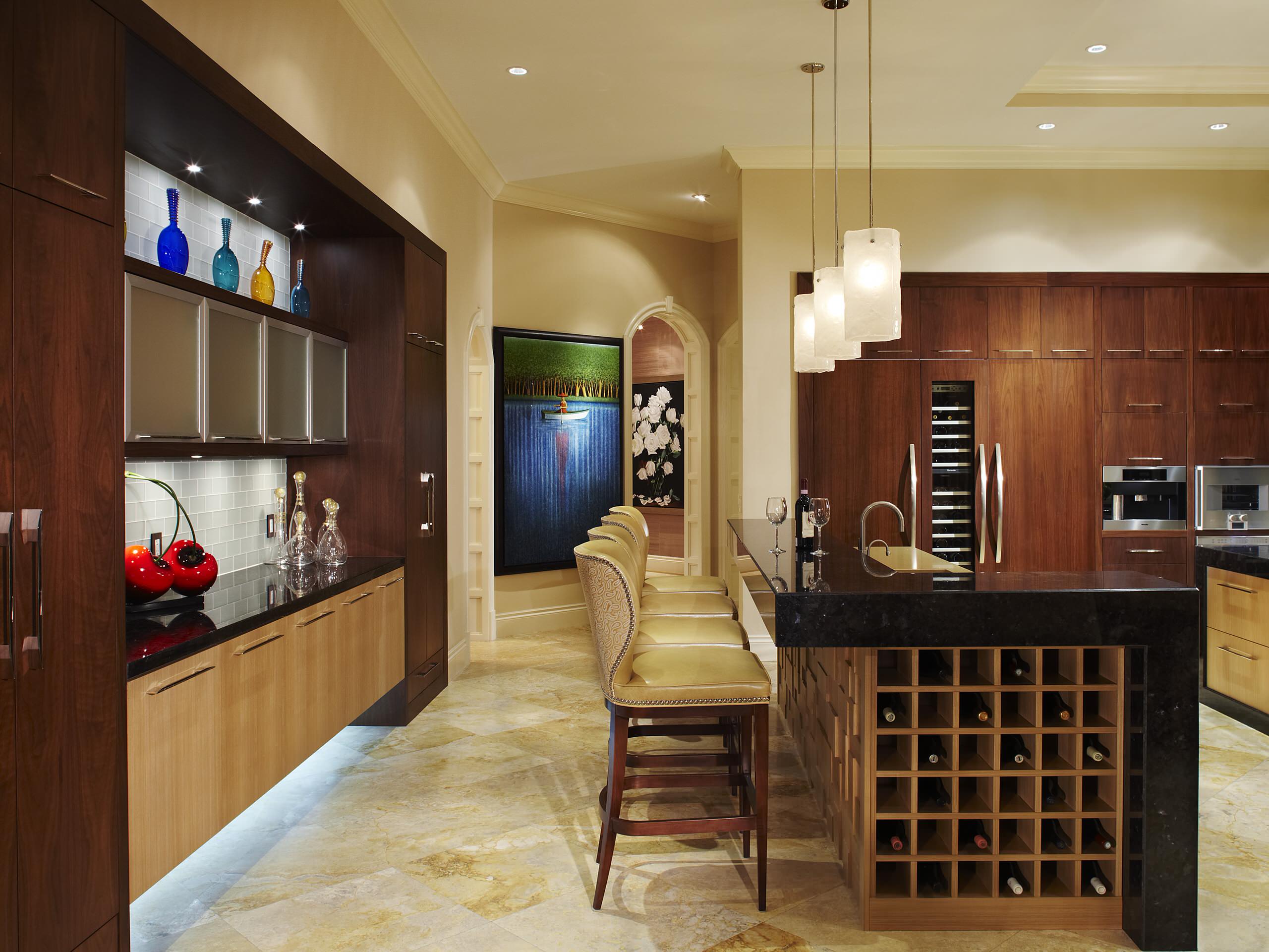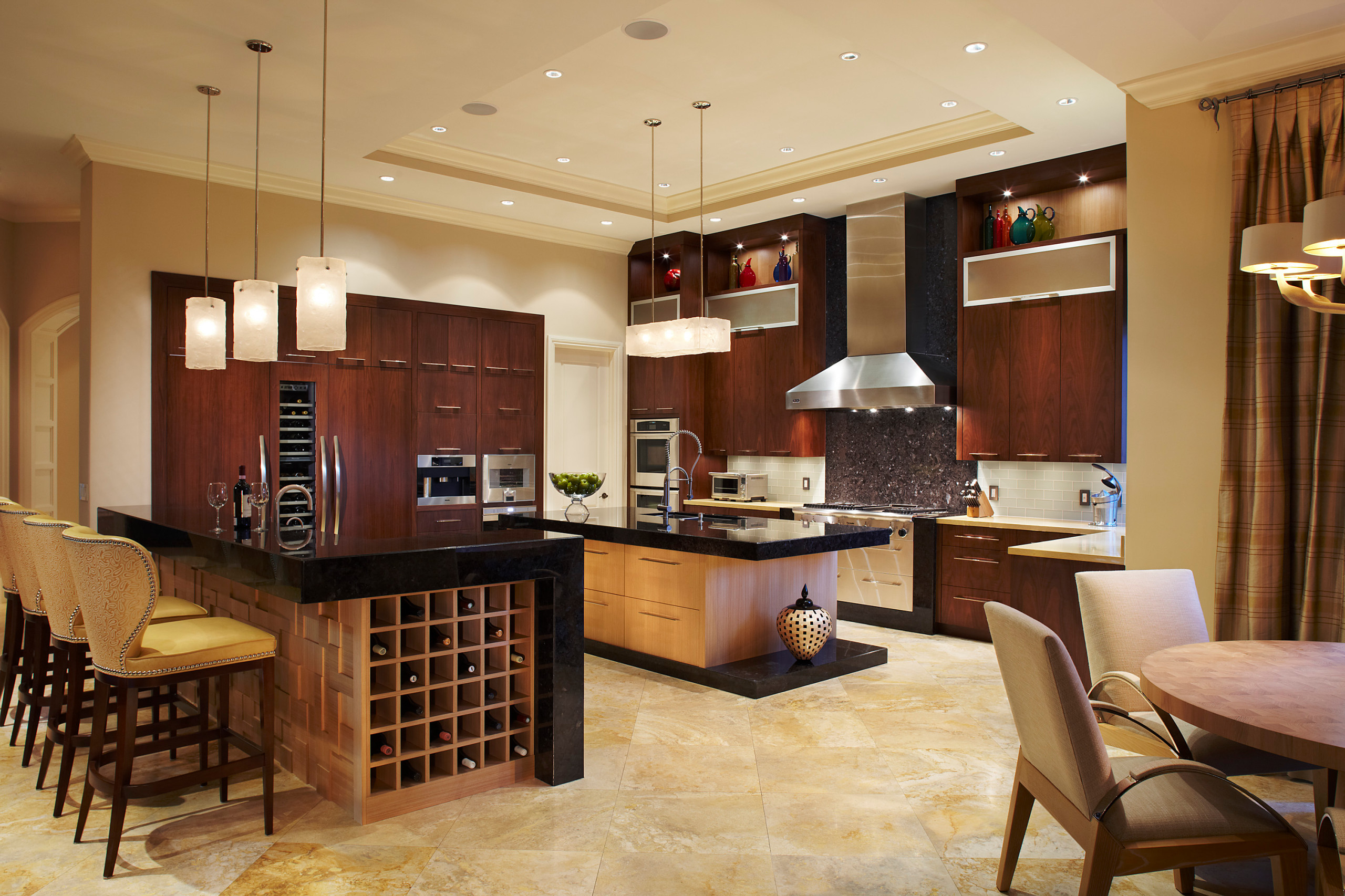 This kitchen features several layers of light: The recessed down lights provide overhead illumination, the pendant lights above the island illuminate the workspace and under-cabinet area, and above-cabinet accent lighting gives the space a burst of savvy style.