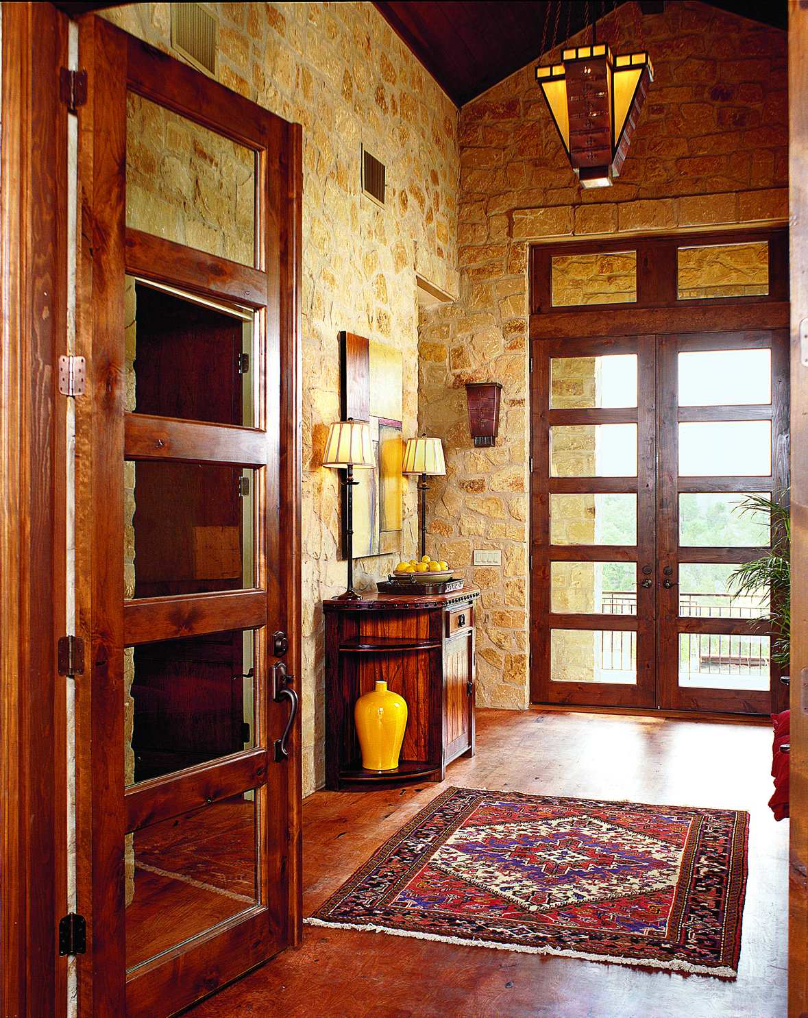 A hot look in light fixtures right now is mixed metal, dulled gold, and foiled silver over gold, as seen here. The finish is popular with the transitional style because it has an antique yet contemporary look.