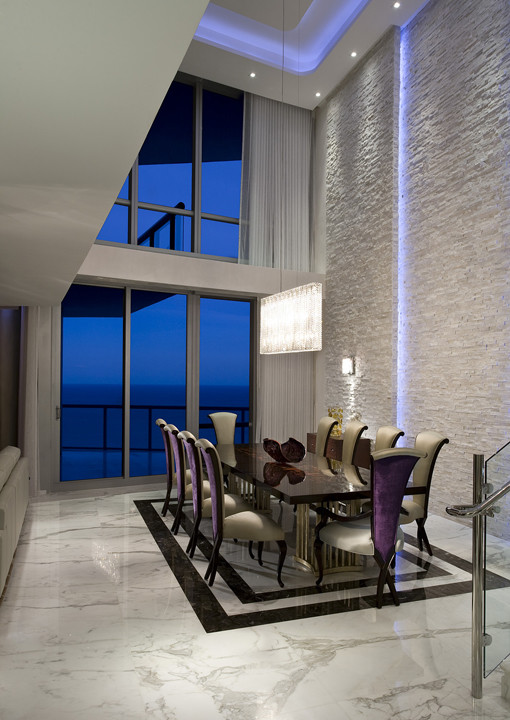 In this dining room, the coloured LED lights in the tray ceiling and alongside the stone wall add dimension and visual interest. Notice how the light calls attention to the texture of the stone wall. Rope or strip lighting achieves this effect.