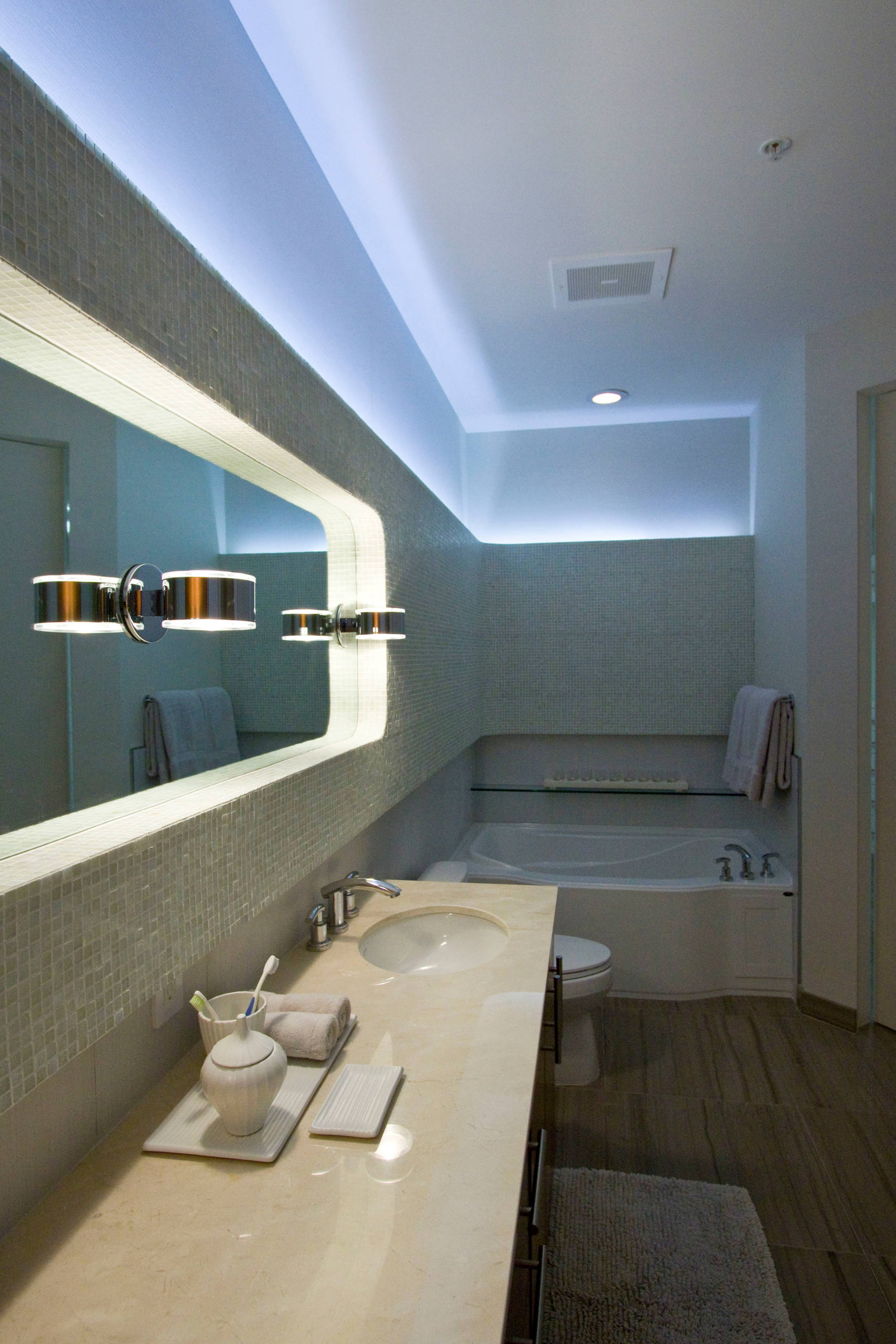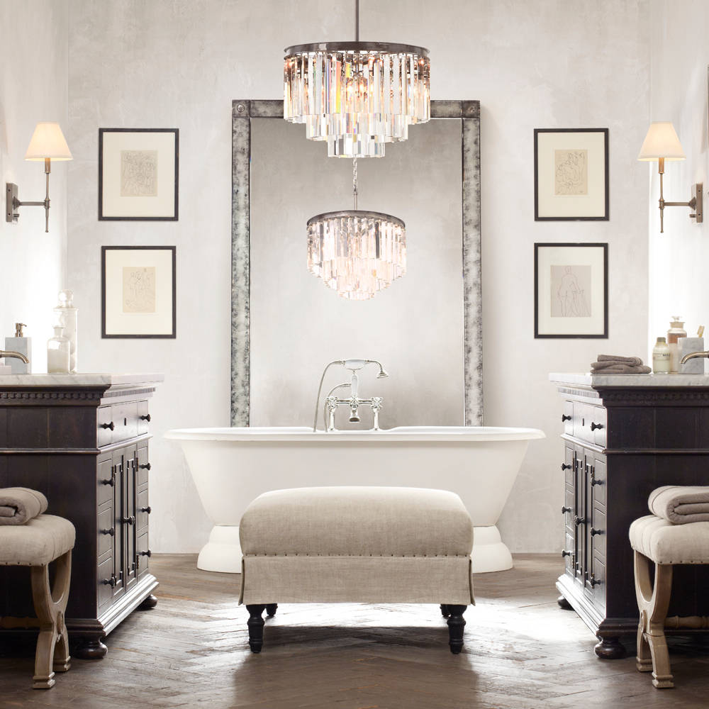 Crystal remains a popular choice for lighting fixtures and is used across the style spectrum. In this contemporary bathroom, the crystal chandelier has a modern presentation, drawing attention to the underlit wave ceiling.