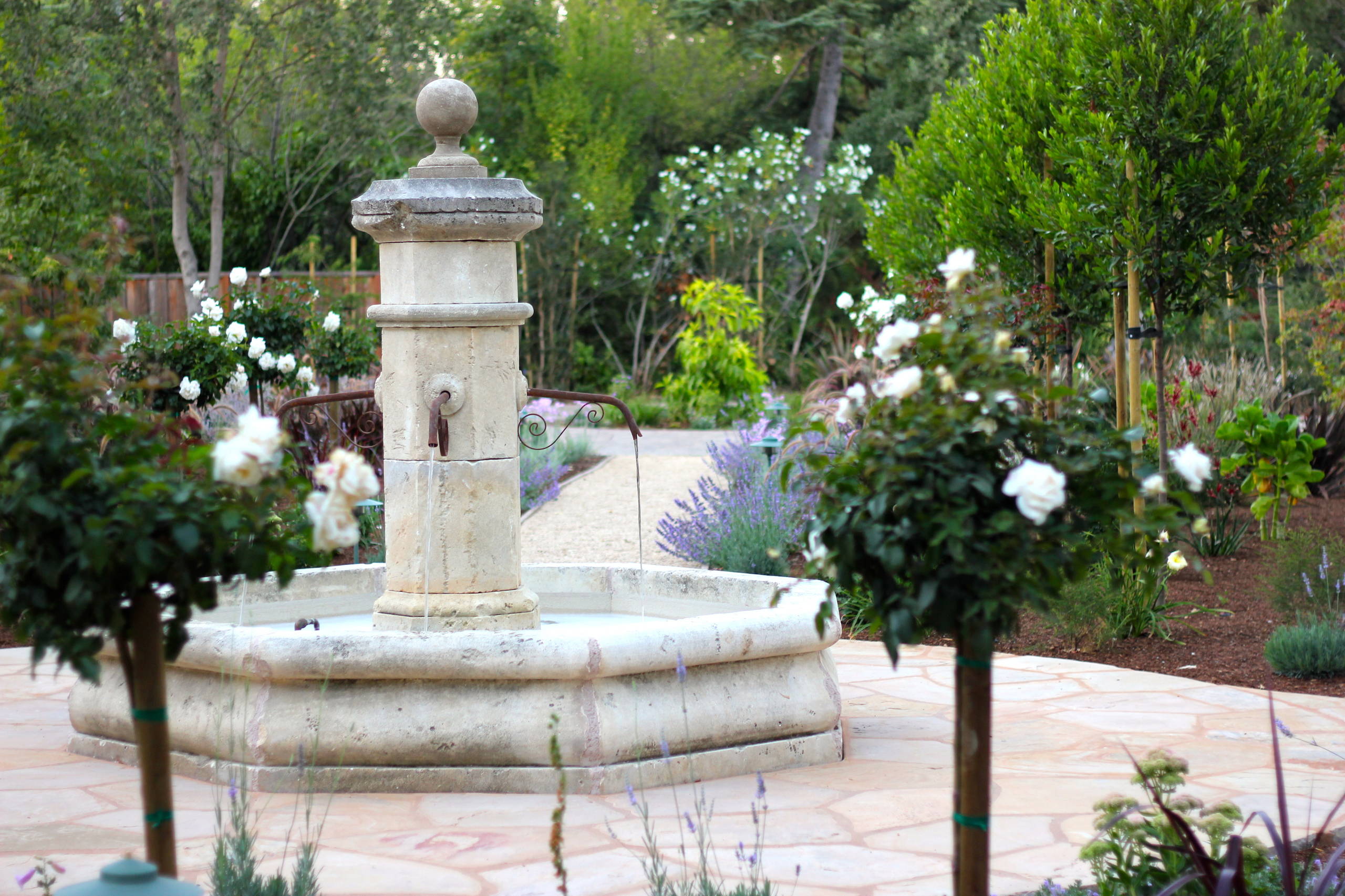 This fountain and courtyard pool is made of cream-coloured limestone. The light coloured stone works beautifully with the gravel in a similar colour.