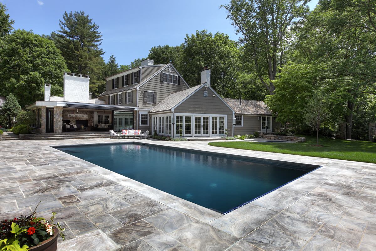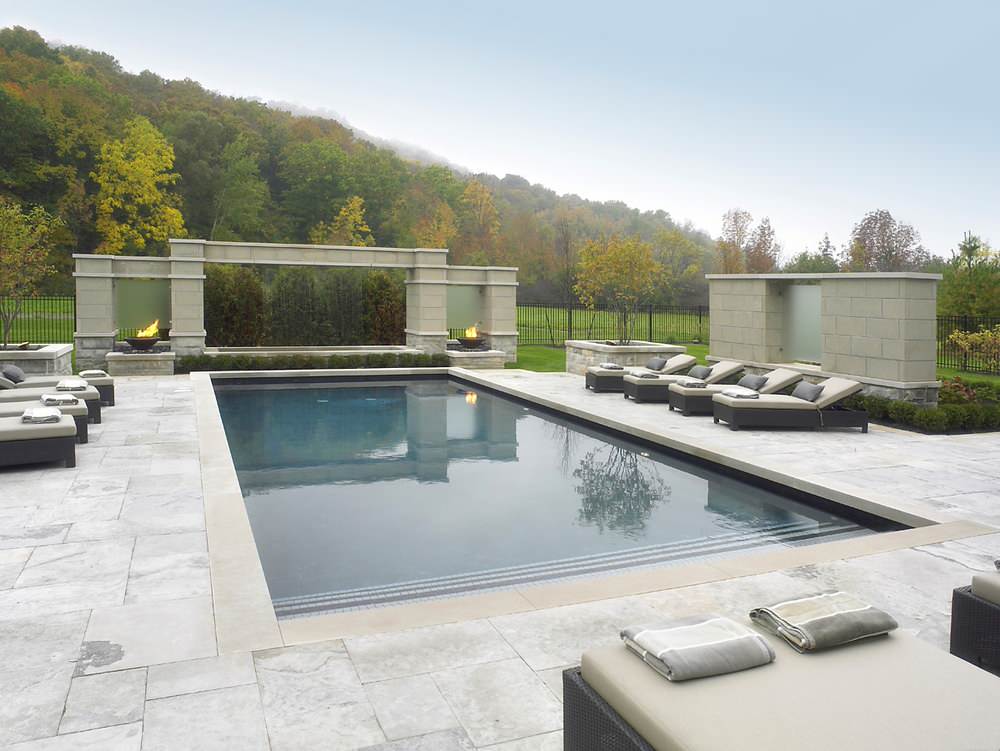 A contemporary flush-edge limestone pool deck. The grey colours are lovely against the changing autumn leaves in the landscape beyond.