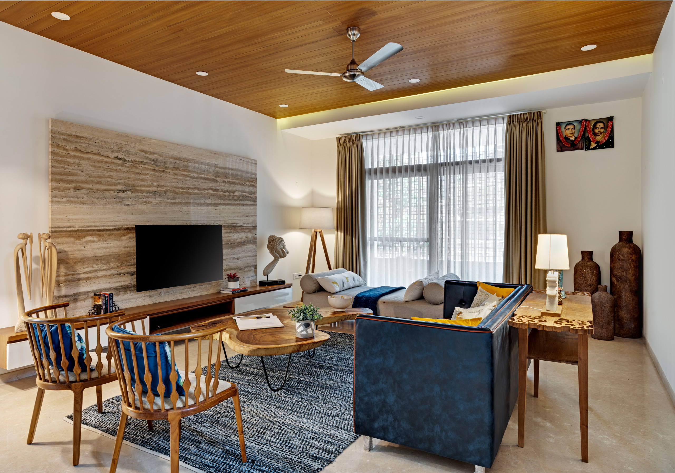 “Natural travertine stone highlights the TV unit, which breaks the monotony of the wall. The wood-clad ceiling creates a cosy environment,” John says.