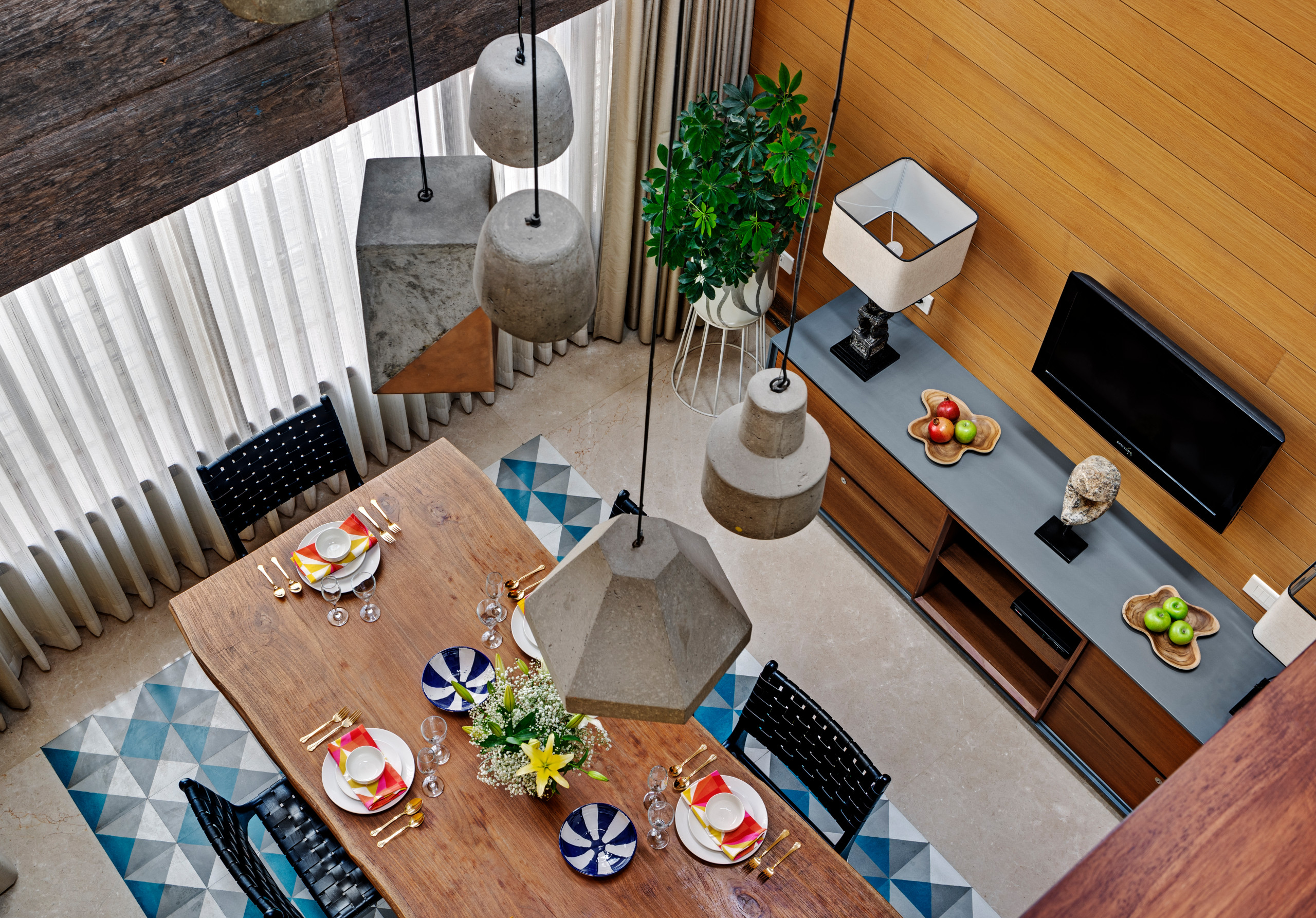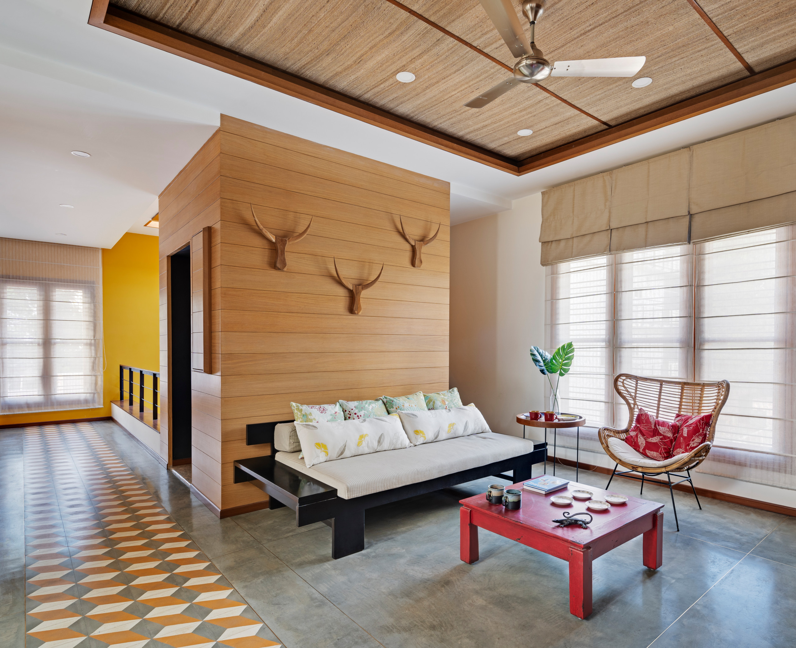The ceiling is clad in banana fibre, subtly accentuated with teak. Juxtaposing cement flooring with a contemporary pattern of cement tiles brings in an interesting interplay of colours.