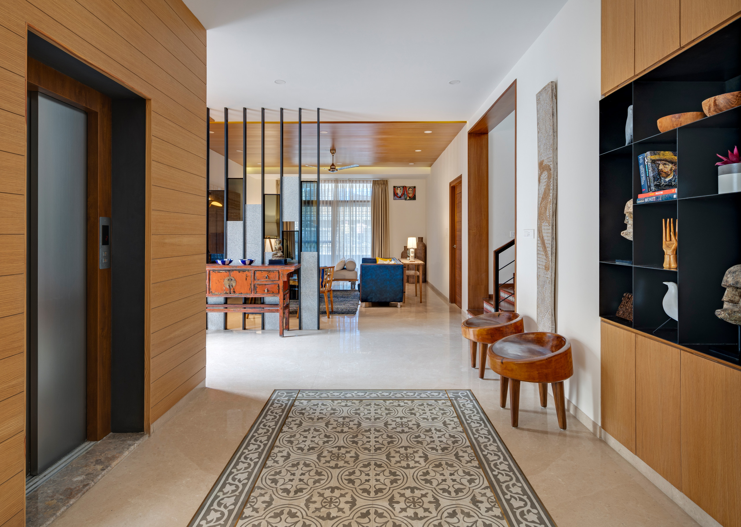 The interiors of this home reflect Indian contemporary ethos with some traditional touches. While the ground floor has provision for parking and a store room, the living spaces start from the first floor, while most of the bedrooms are on the second floor. The lift from the ground floor gives direct access to the first floor. As one enters from the foyer, the living room with an adjoining balcony and one bedroom are on the left.