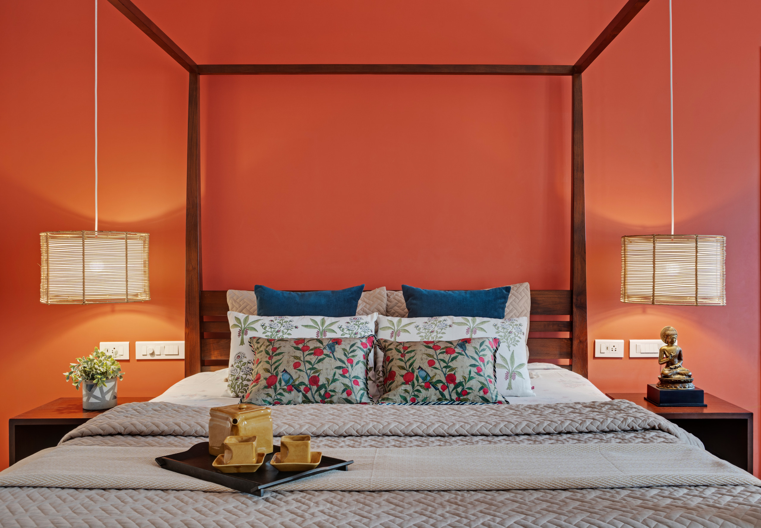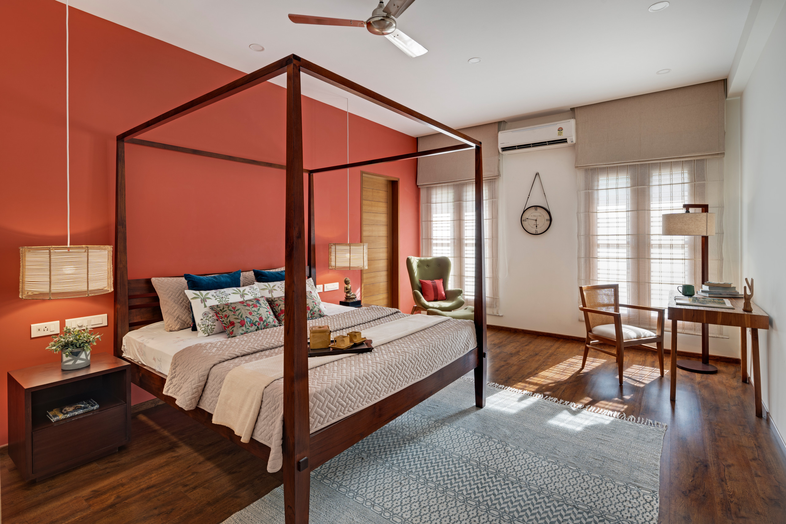 The matte red accent wall serves as a striking backdrop for the four-poster bed and wooden flooring. Sunshine bathes the space and induces a happy mood.