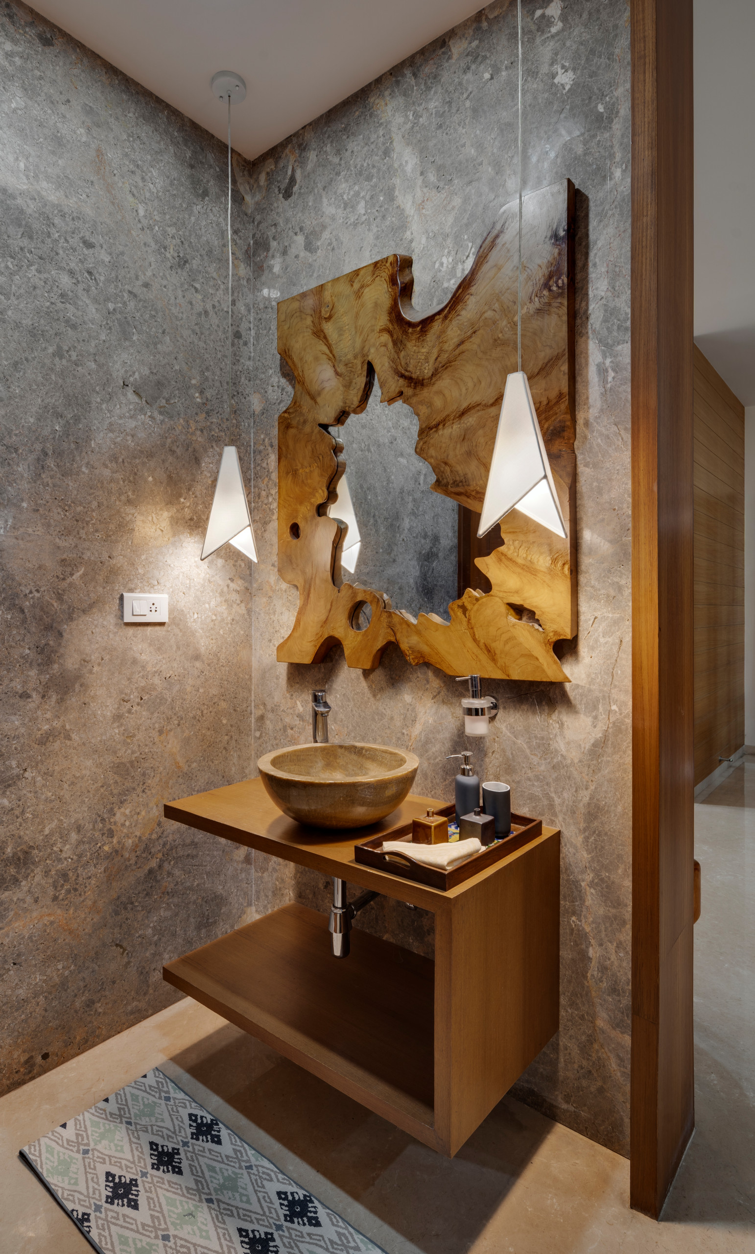 “The powder room on the lower floor has walls of crocodile travertine. The mirror is made of reclaimed wood and is framed by fabric lights sourced from Bali. It also has a wash basin made of onyx,” Patel concludes.