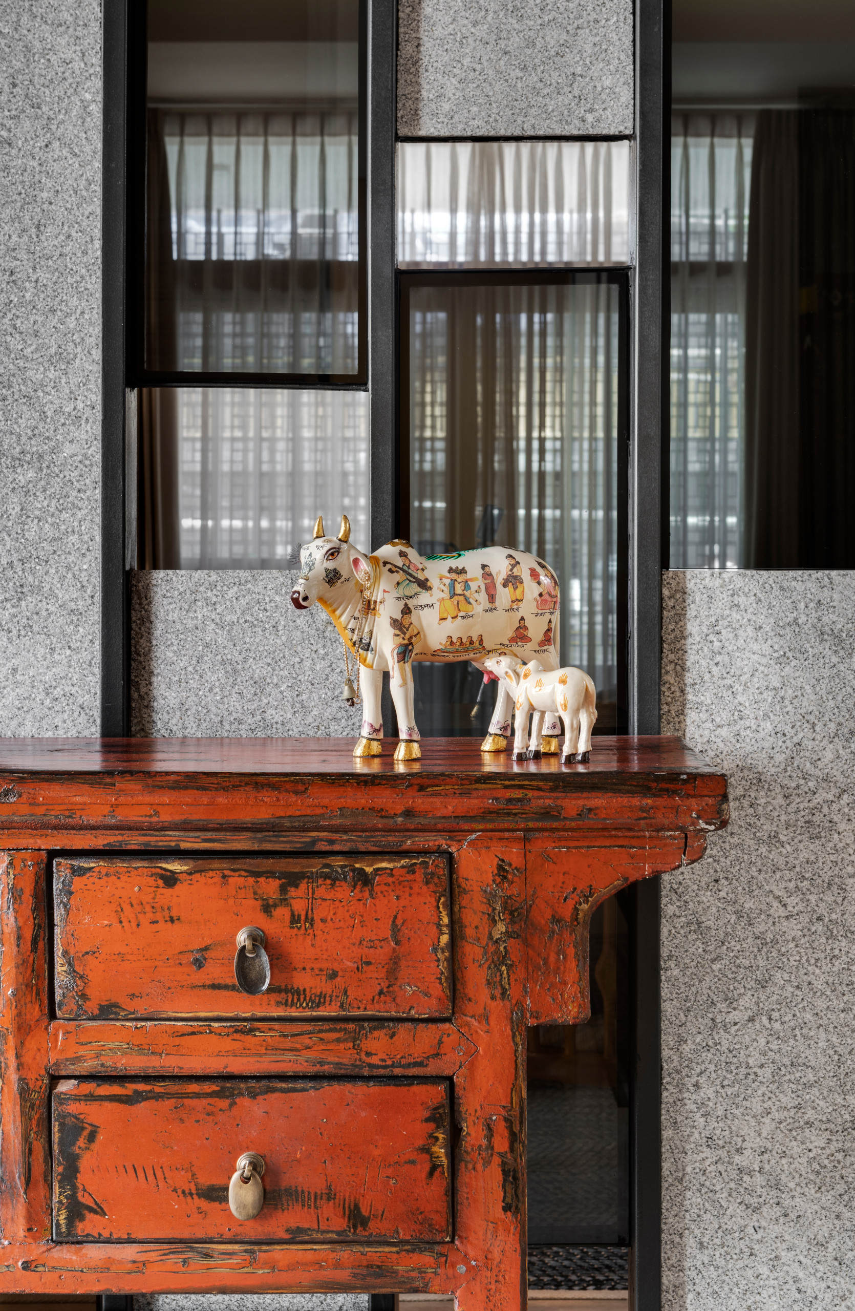 As one heads to the living room, the eye is caught by a distressed rusty orange table adorned with ornate Indian artefacts, which gives a stylish touch to this space. The fusion of ethnic heritage elements with contemporary pieces lends a hint of eclecticism to the decor.