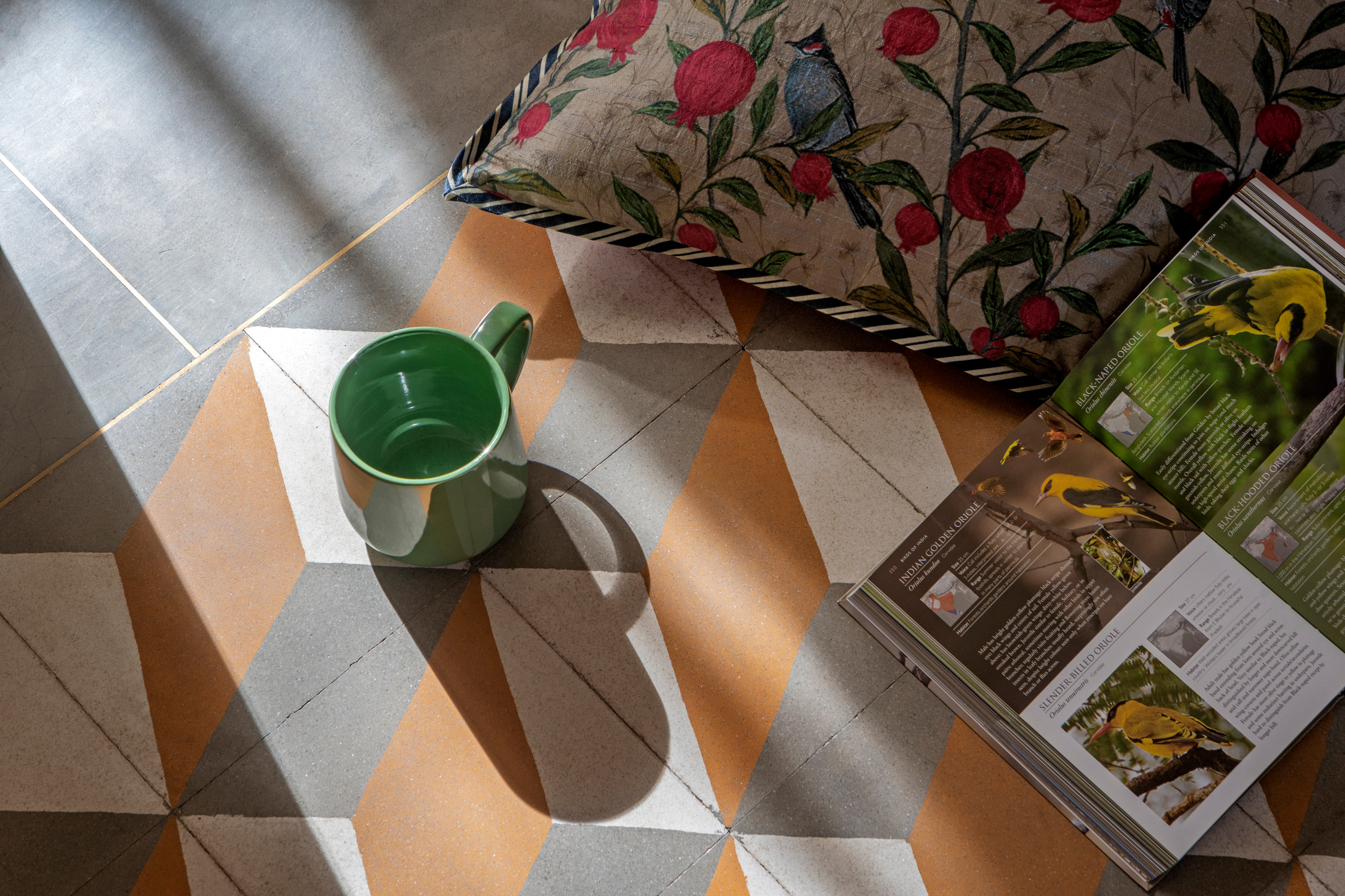 “The polished cement flooring complements the earthy theme throughout the house. The brass inlay in the tiles adds a dash of luxury to the flooring,” says Patel.