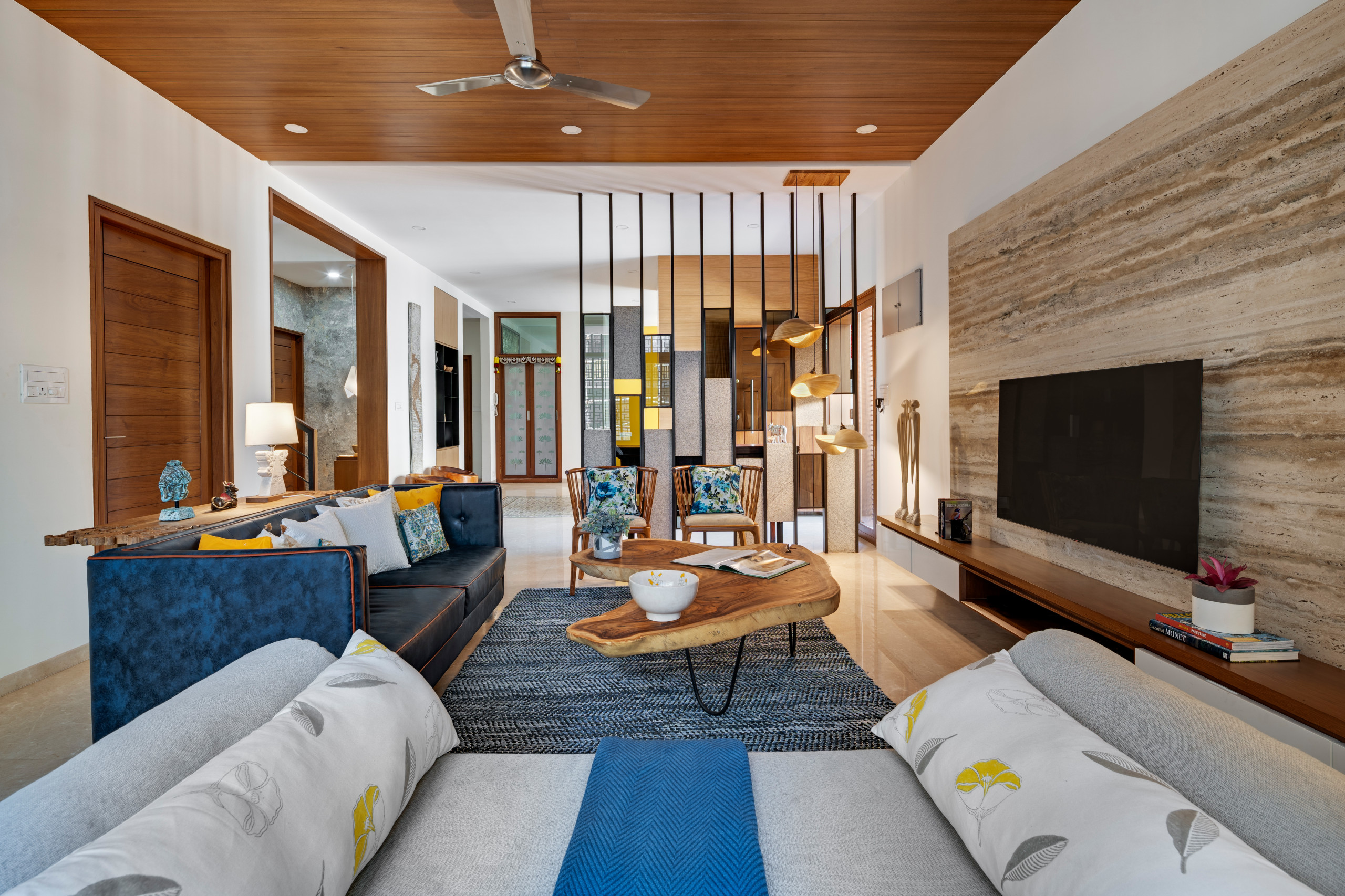 Homeowners Raghu and Meera Natraj’s brief to architects Joshua John and Juhi Patel of Yellow Door Architects was to keep the decor raw and down to earth. The designers created a home which blended traditional and contemporary decor elements, while comfortably accommodating the needs of the family. John says, “We are proud to have created a home that the three generations of the family can relish individually and where they can also find comfort collectively.”
