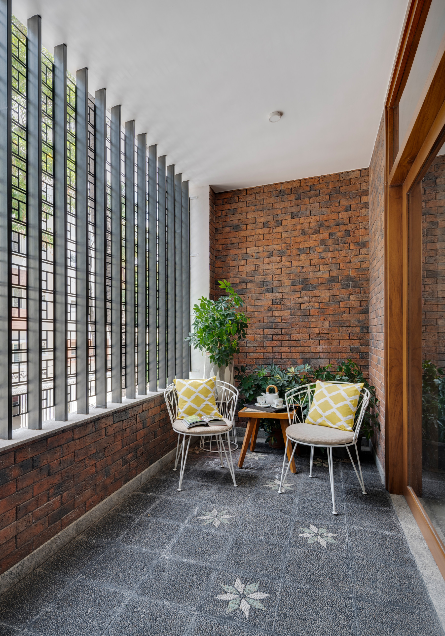 The balcony next to the living room embraces industrial decor, with exposed bricks and metal grilles. The grey textured surface of the flooring ties the look cohesively.