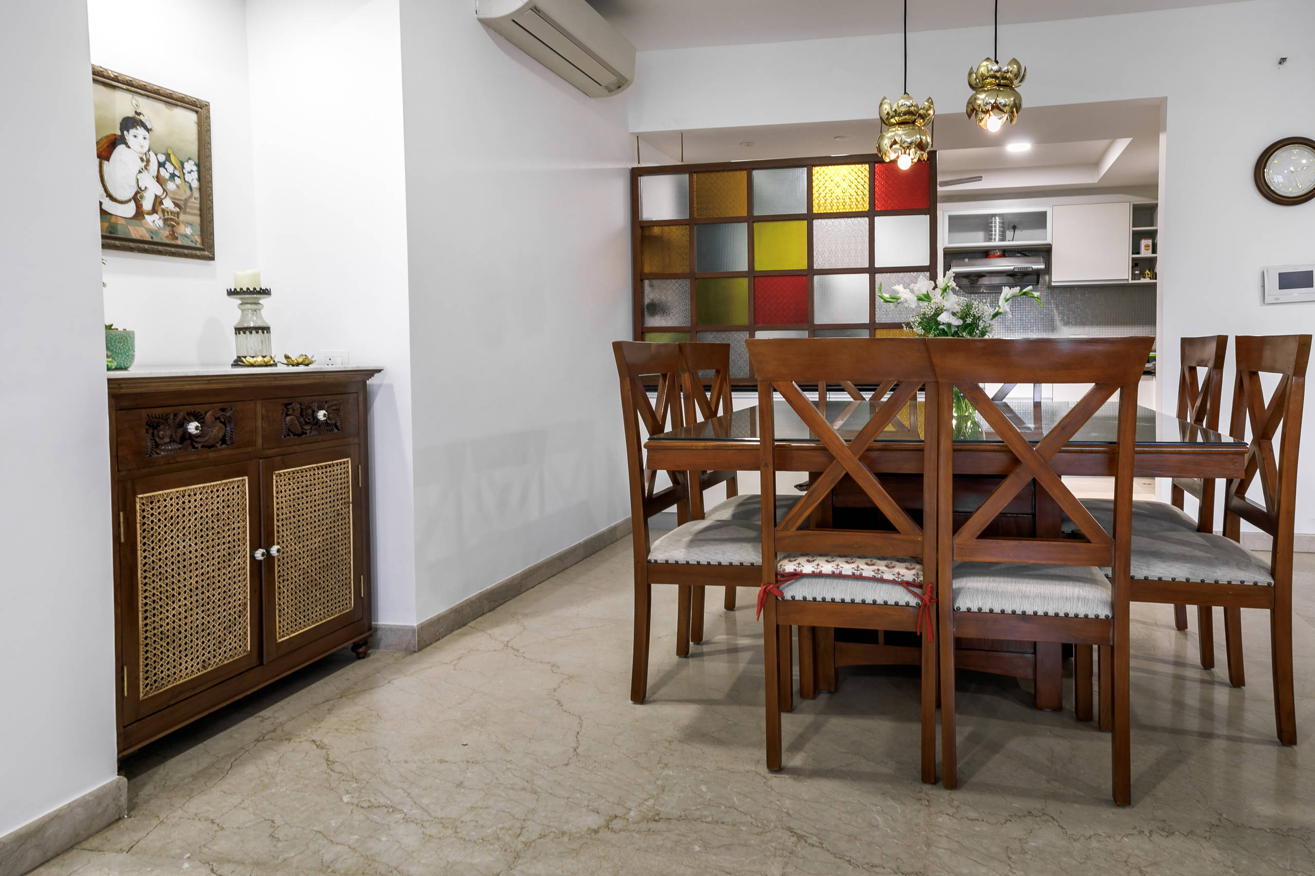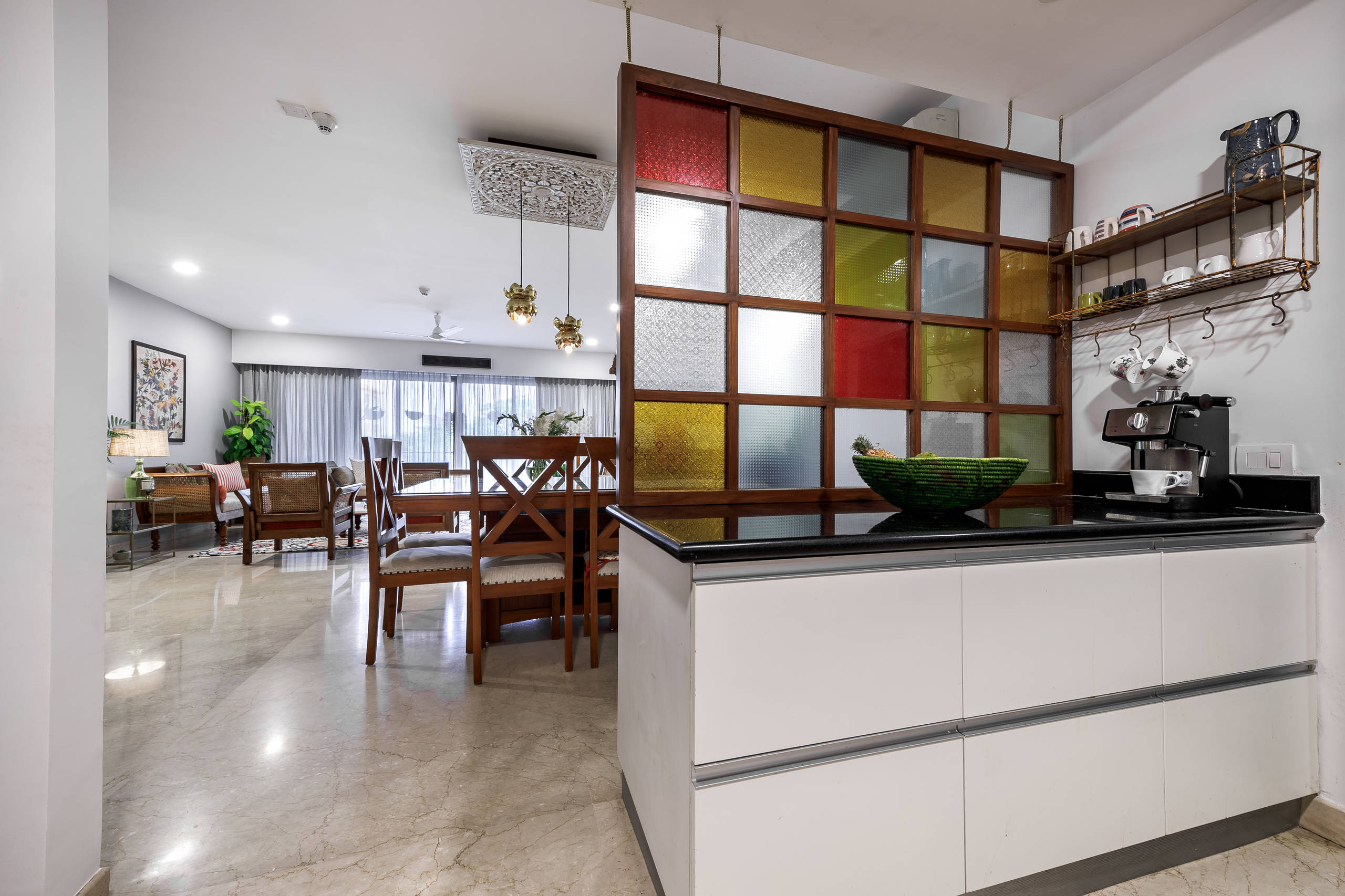 “Our key project was to create a partition between the open kitchen counter and the dining area. In line with the old-world charm they loved, I choose a teak-finish window frame with etched colored glass pieces that is suspended from the ceiling by brass chains,” Amarnathan says. Originally fashioned for privacy, the screen has now become the star statement piece of the entire room. Another feature that brings in that sense of old-world charm in the kitchen is a vintage-style wall shelf.
