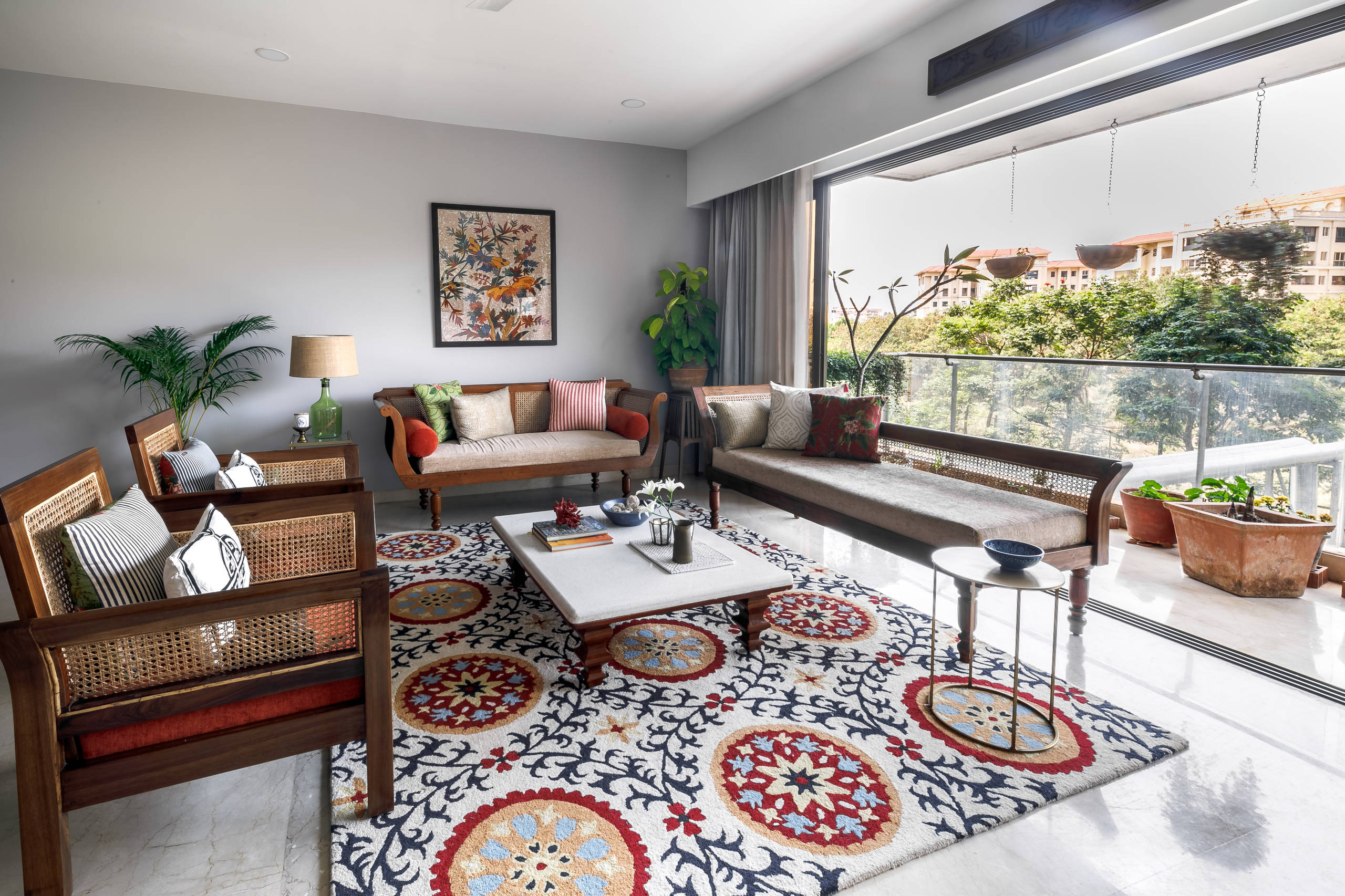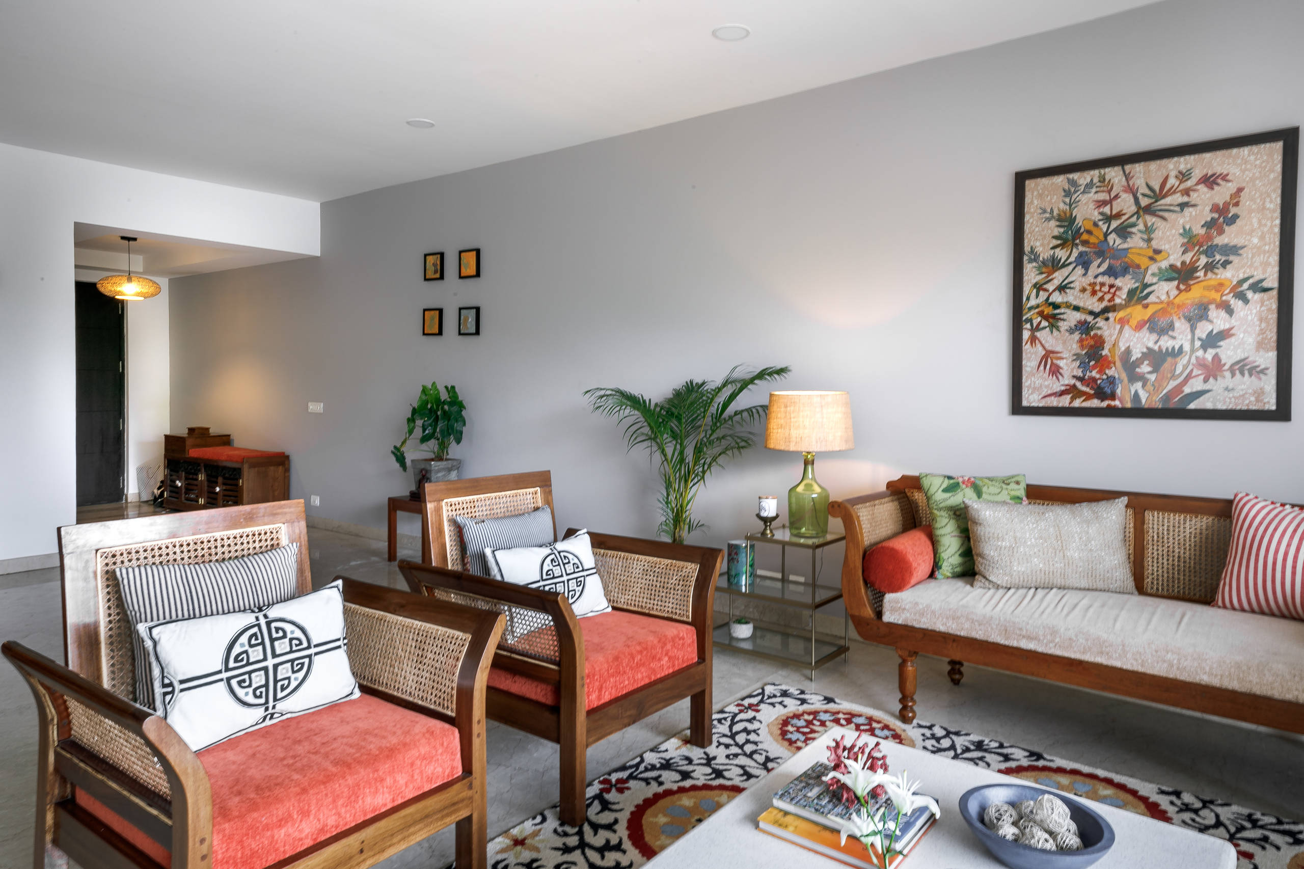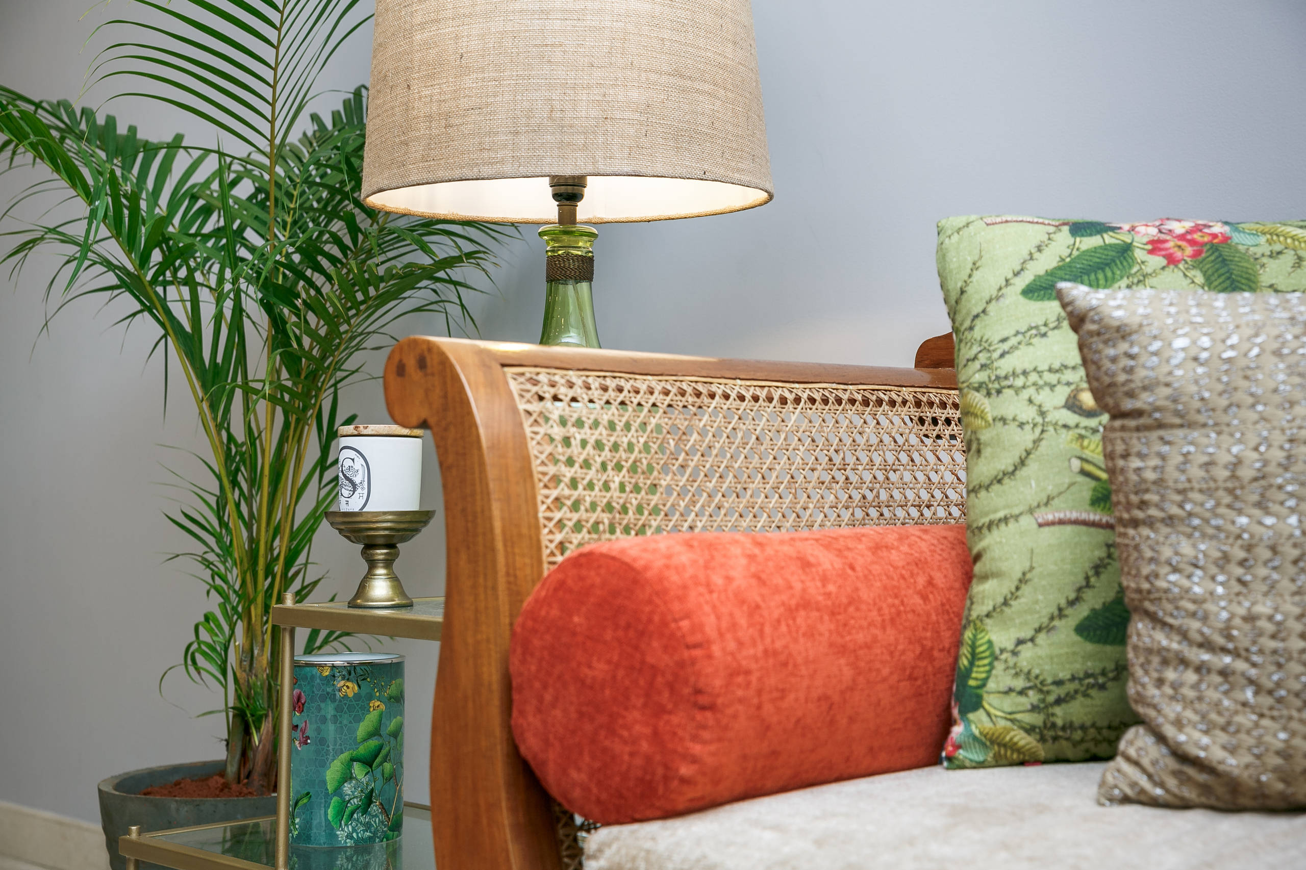 By incorporating several potted plants into the decor, the designer has infused freshness into the space. Gold accents like glass-and-brass end tables also help to break the heaviness of the wood-and-cane furniture. “We brought in accessories like a beautiful green table lamp and simple modern pillows blended with vibrant patterned ones,” Amarnathan says.