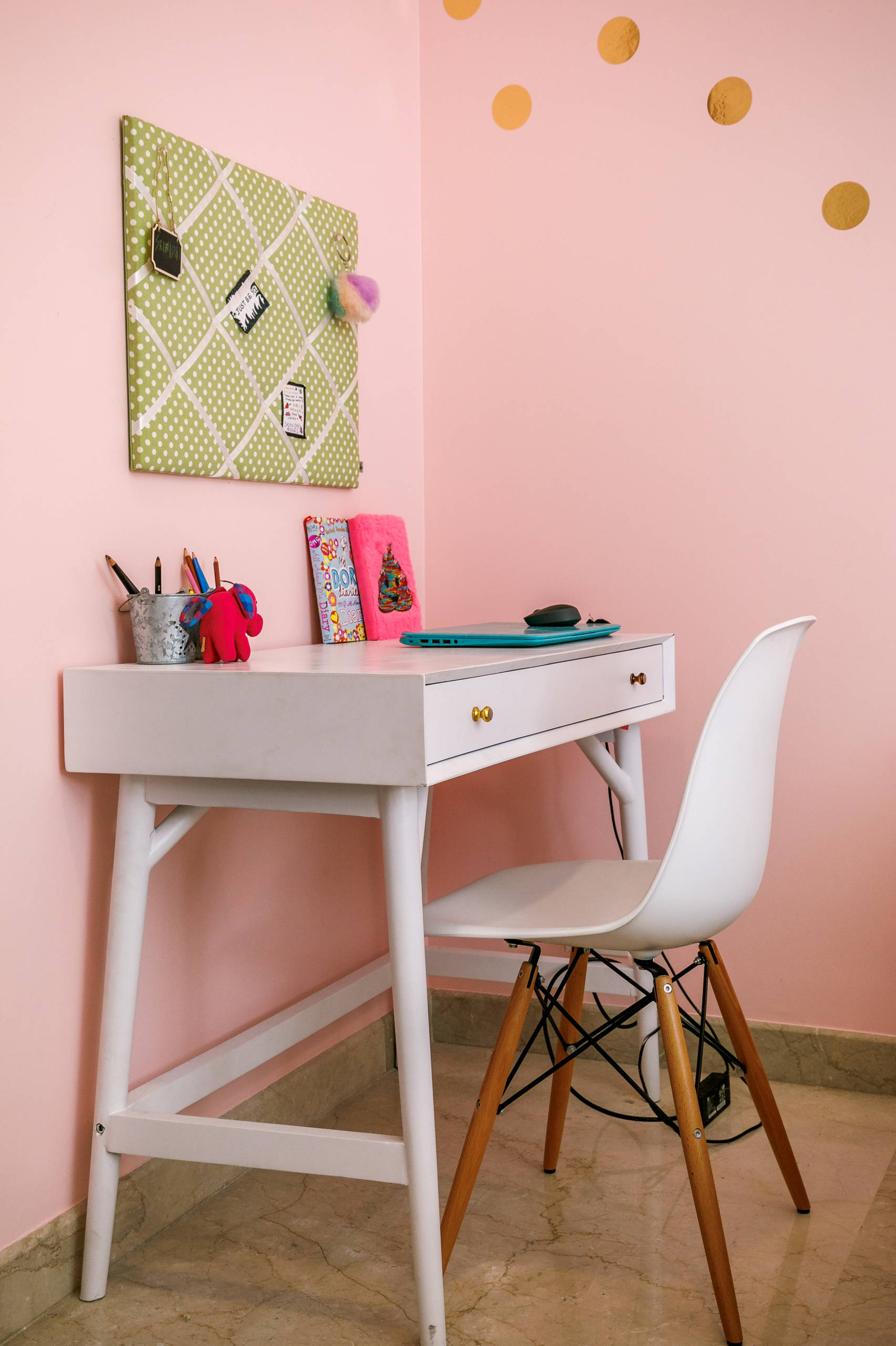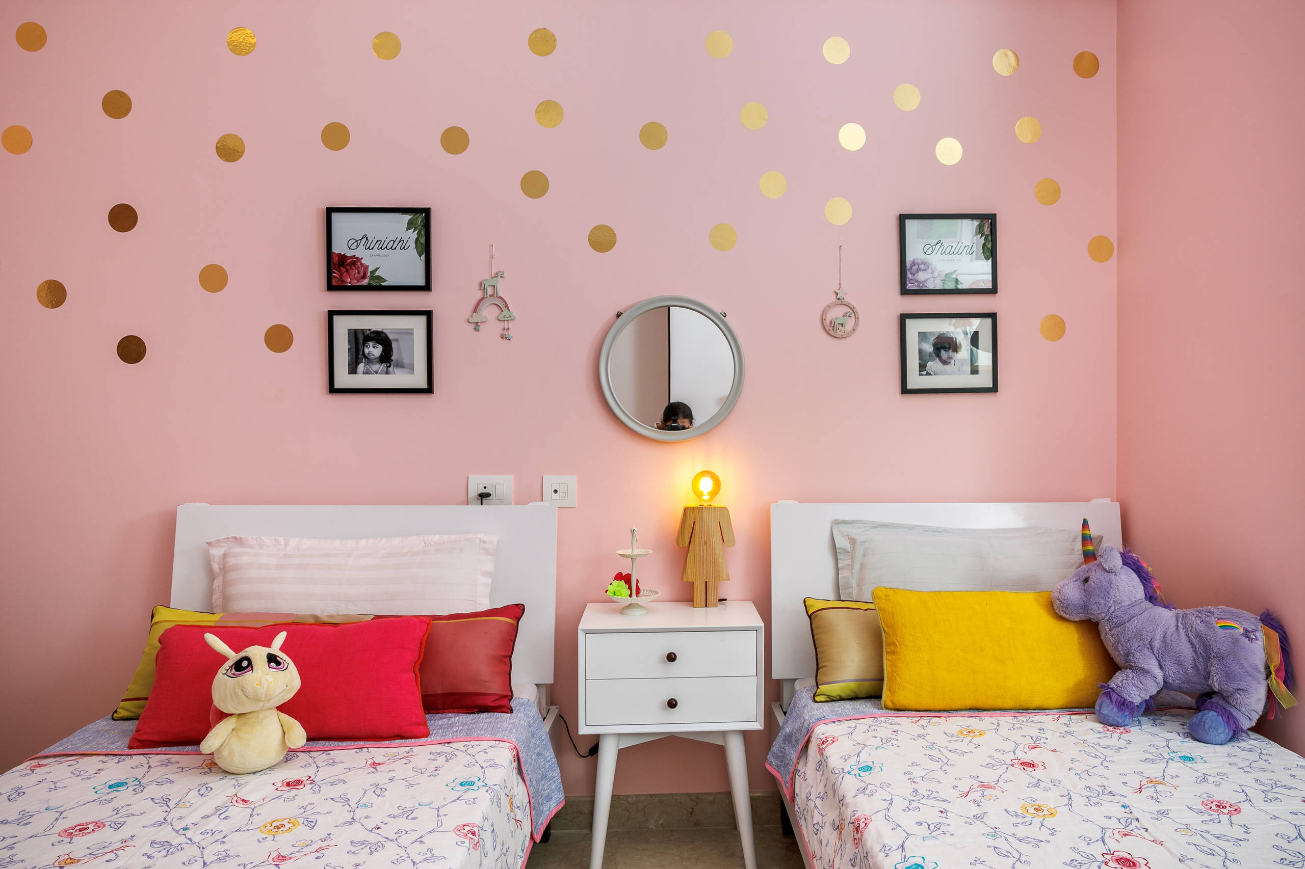 Beds and desks: Asian Arts; white Eames replica desk-chairs: Urban Ladder; girl-shaped wood lamp: The Purple Turtles; framed name prints: Kookinuts on Etsy; striped rug: Jaipur Rugs; pin boards: The Wishing Chair