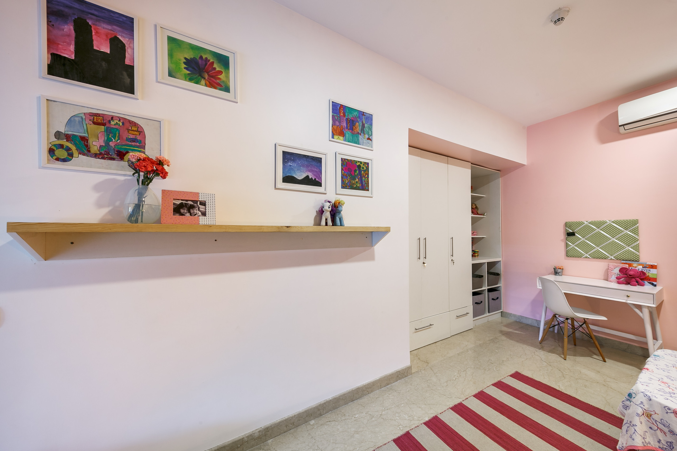 “The wardrobes were refinished in white and we added drawers at the bottom. On the far end we added a simple built-in shelving unit to hold books, toys, arts-and-crafts materials and so on,” she continues. A fuchsia-and-white striped rug keeps with the colour scheme while adding another level of patterns. A natural wood-finish ledge holds photographs and knick-knacks. Above it, a gallery wall has been fashioned using framed artworks by the girls, further personalising the room.
