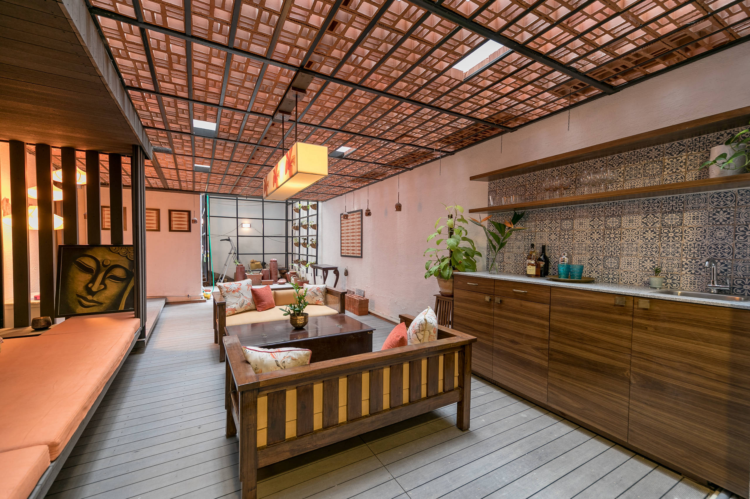 The clients also wanted to revamp the terrace. “They wanted an area in the terrace where they could make and enjoy their morning coffee and also entertain in the evenings,” Amarnathan says. The designer added a wet bar with a sink that takes centre stage because of the backsplash of blue-and-white Spanish-pattern tiles. “The tiles complement the warm oranges and mustard used in the rest of the terrace,” she says.