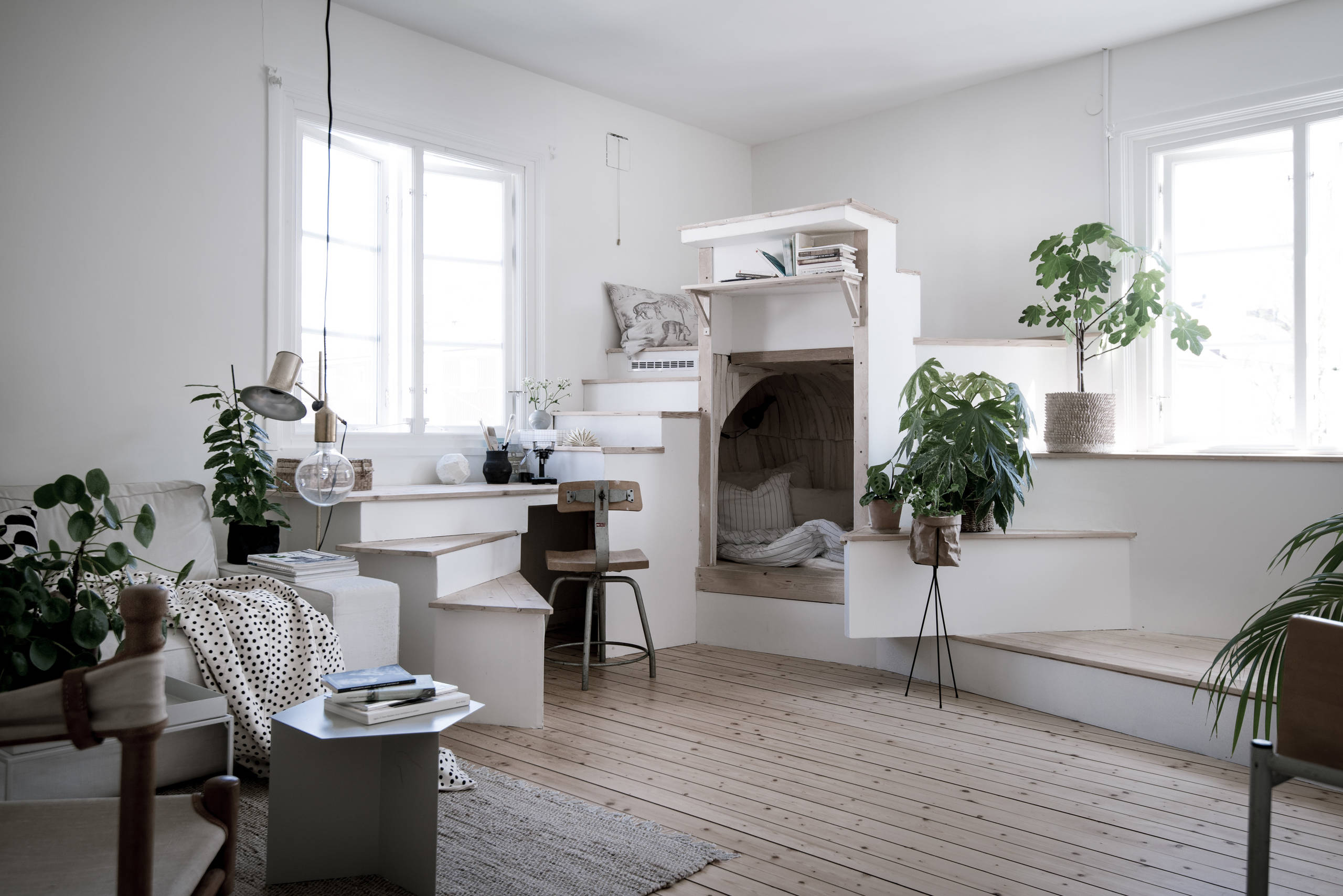 Why we love it: The charm of this cheeky space lies in its odd angles and offbeat design that have been deliberately emphasised. Its cubby-like character is tempered with a uniform palette… and of course, the splash of verdant greenery is the perfect decorative touch.