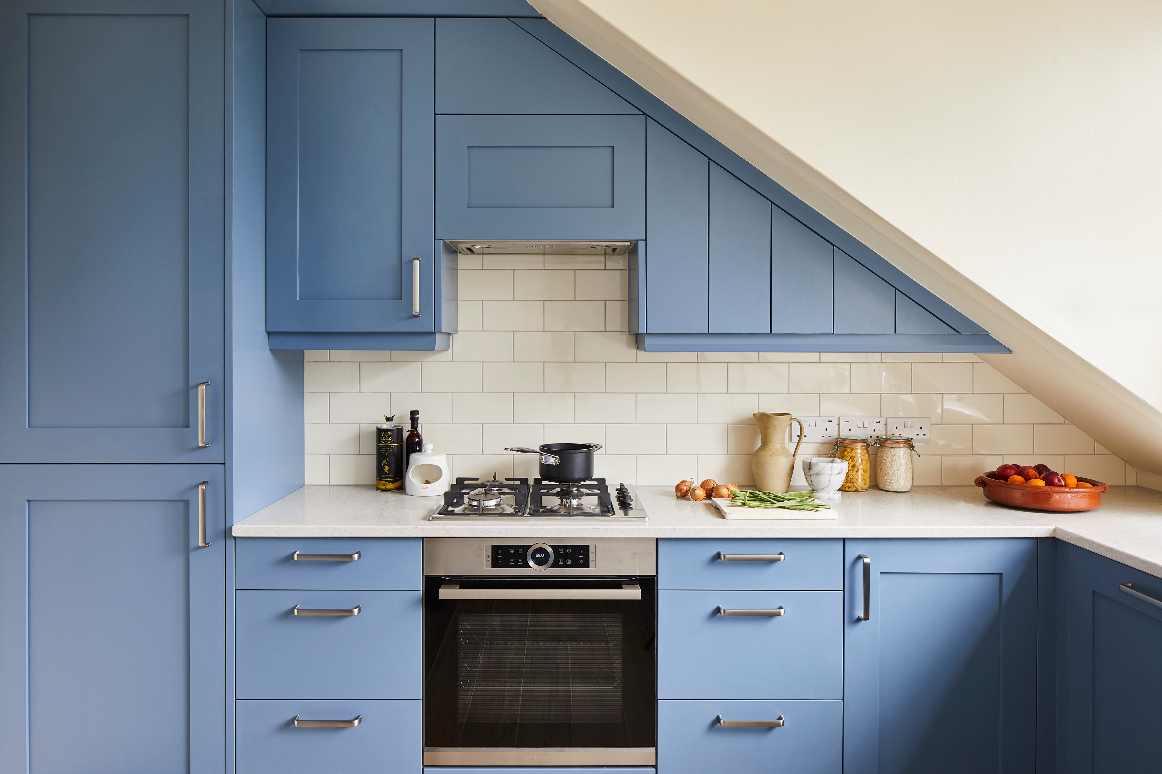 Why we love it: This kitchen wall could be mistaken for living room joinery at first glance, thanks to the generous proportions of those drawers and the low splashback that runs the length of the room. By treating kitchen cabinetry more like custom joinery and siting the table by the bay window, the room’s two functions – cooking and dining – merge together harmoniously in one oblique space.
