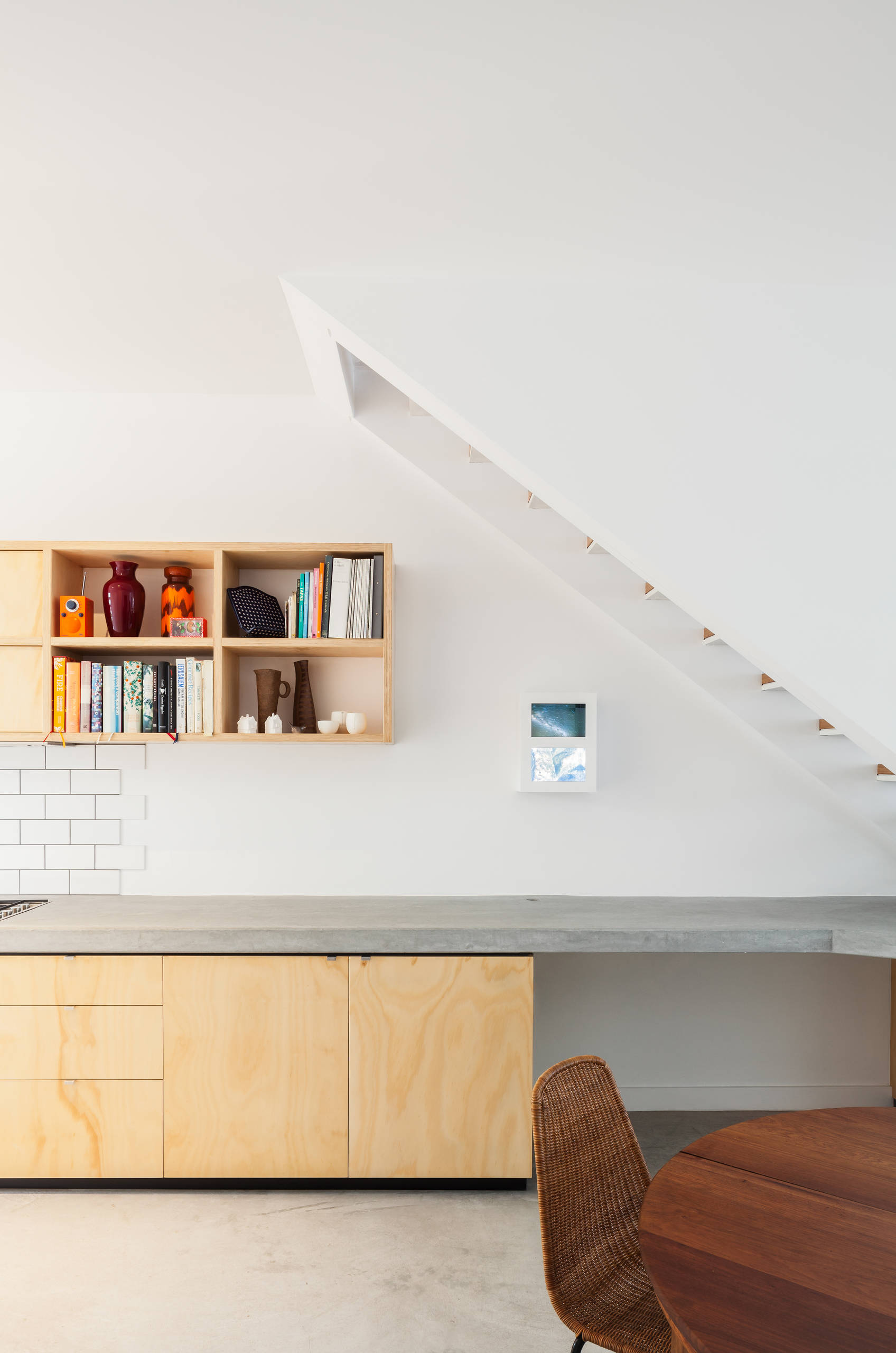 Why we love it: How do you fit in a kitchen below a run of stairs without blocking out the light? With open treads, it turns out, which this home has made a nifty feature of.