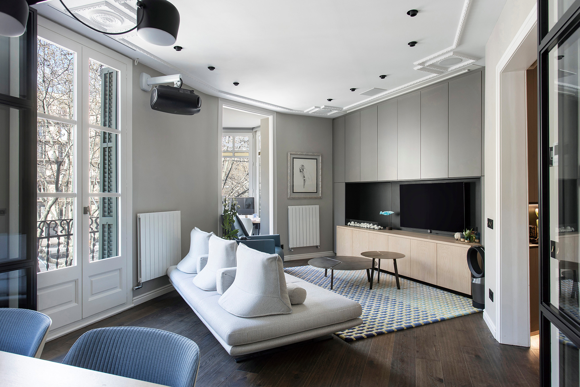 Why we love it: This odd-shaped space contends with a lot: French doors that open onto a balcony, a hidden study, a separate entrance, a living area and a dining zone. But despite the odd angles and multiple flow points, the layout works beautifully – in part due to the sofa that acts as a room divider…