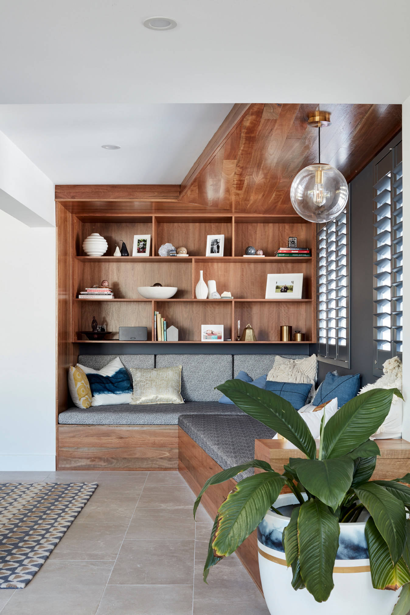 Why we love it: When your home presents you with a challenging angle, try to consider it in section-view, rather than in plan. Here, bespoke joinery on the ceiling mirrors the form of the banquette below it. This creates a beautiful feature that’s also functional for display and storage.