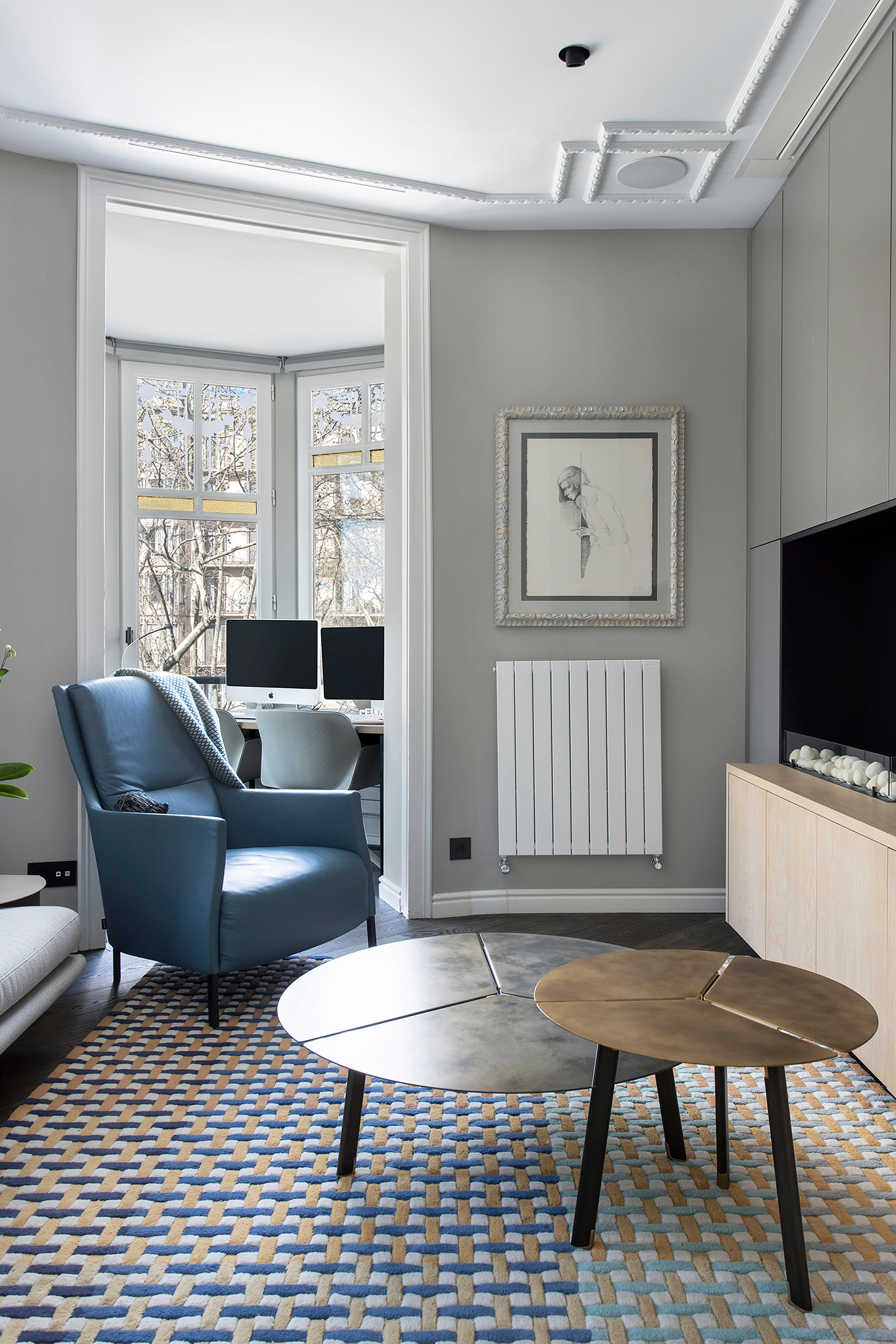 Why we love it: Rather than try to disguise the radiating lines of this room, the designer has chosen to embrace them. The arrangement of furniture and cabinetry along the periphery has the effect of opening out the fan-shaped room, giving the illusion of space.
