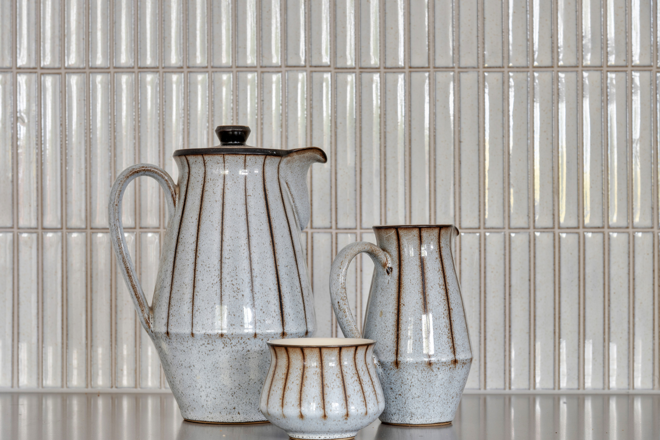 The slim Japanese tiles create a splashback on both sides of the kitchen. “I didn’t want to do something that would feel too clinical, because that’s the problem when you do clean lines – it can feel quite cold if you’re not careful,” Mia says. “[With the splashback,] I wanted to do something that would feel organic, and these tiles are all handmade and a little bit different; they have a speckled aspect to them. A sleek splashback would have flattened the whole thing.”