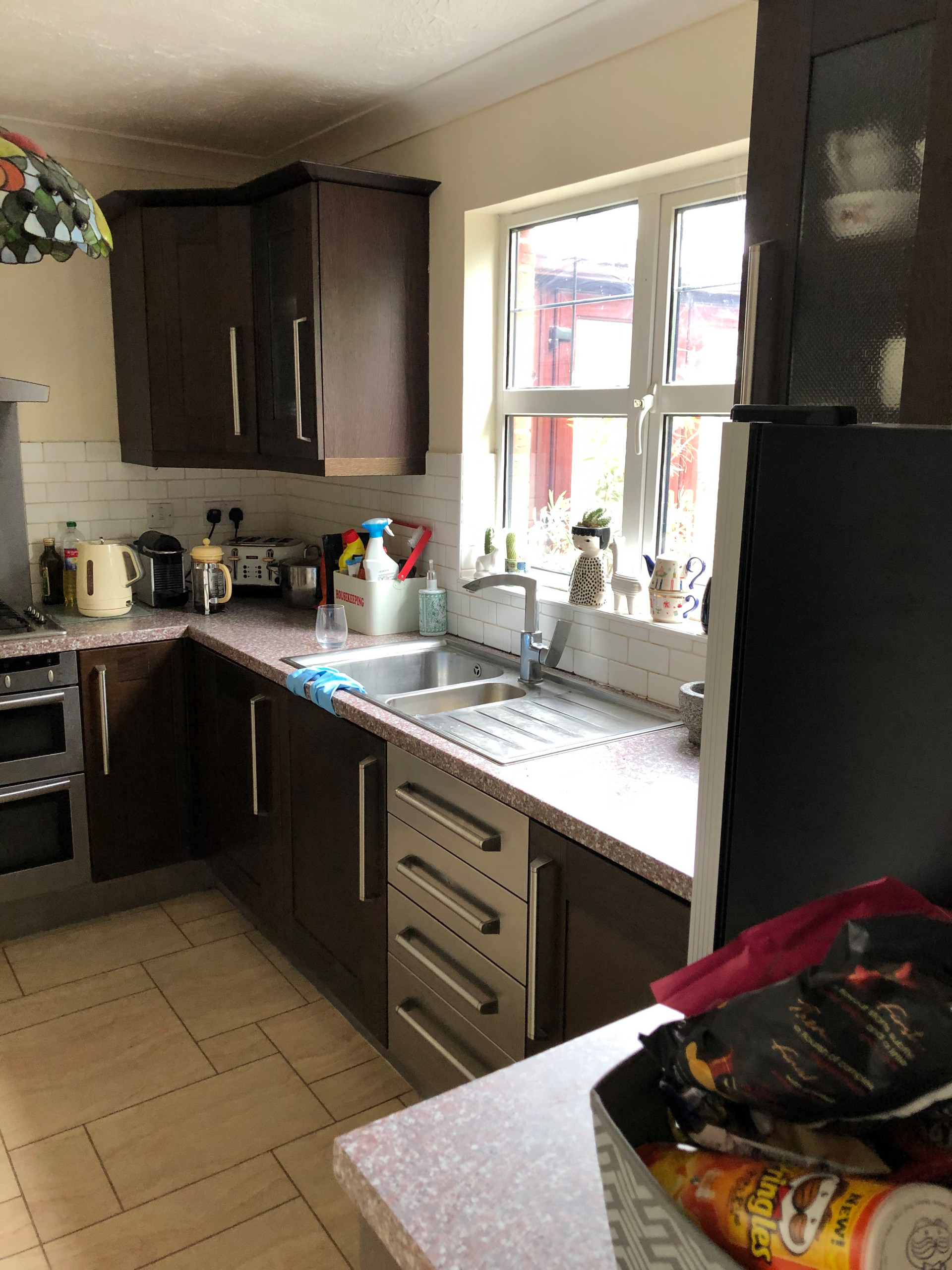 Mia’s first task was to make the layout work harder within the original footprint, and that meant removing walls. In this ‘before’ photo, the wall behind the oven separated the kitchen from a 4m x 4m space that served as a corridor between the living room and the conservatory, which you can just see out of the window.