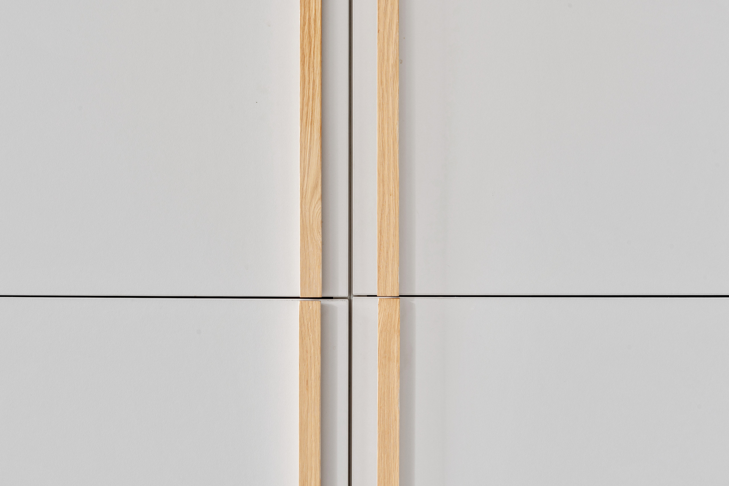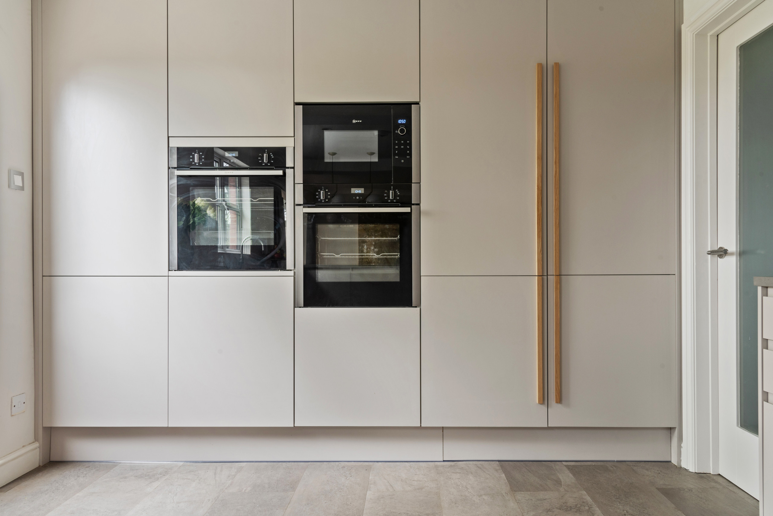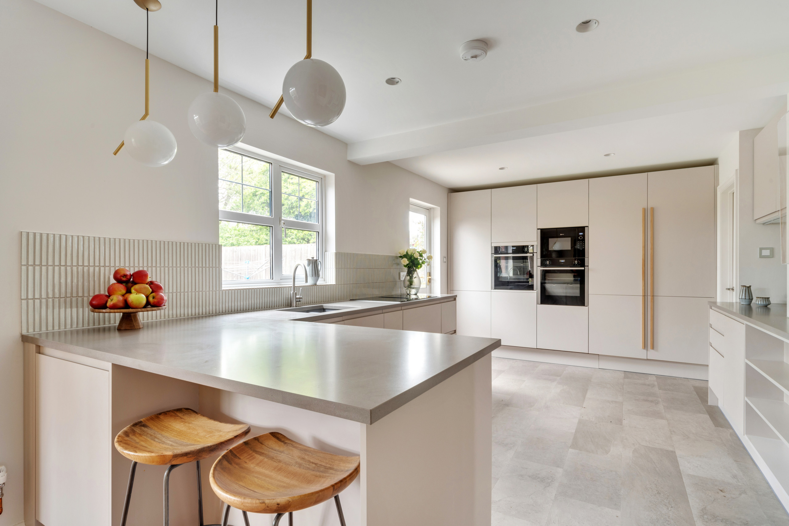 The wooden handles on the breakfast cupboard and fridge-freezer add interest to the bank of units. “When you have a neutral space with no bold colour, the details need to be special so the scheme doesn’t feel too flat,” Mia says. “We used handmade oak handles on the bank of cabinets and a really beautiful Japanese tile for the splashback [see the next photo]. These details really help to elevate the design.”