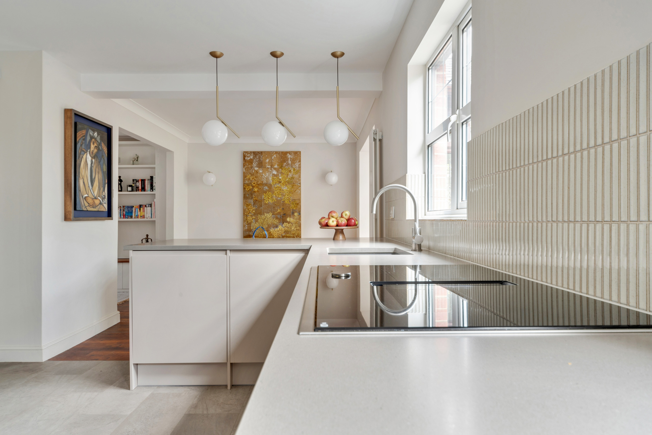 The work surface is engineered stone. “It has the warmth of concrete with the practicality of quartz,” she says. To avoid interrupting the sightlines in the new space, Mia chose a hob with an integrated extractor.
