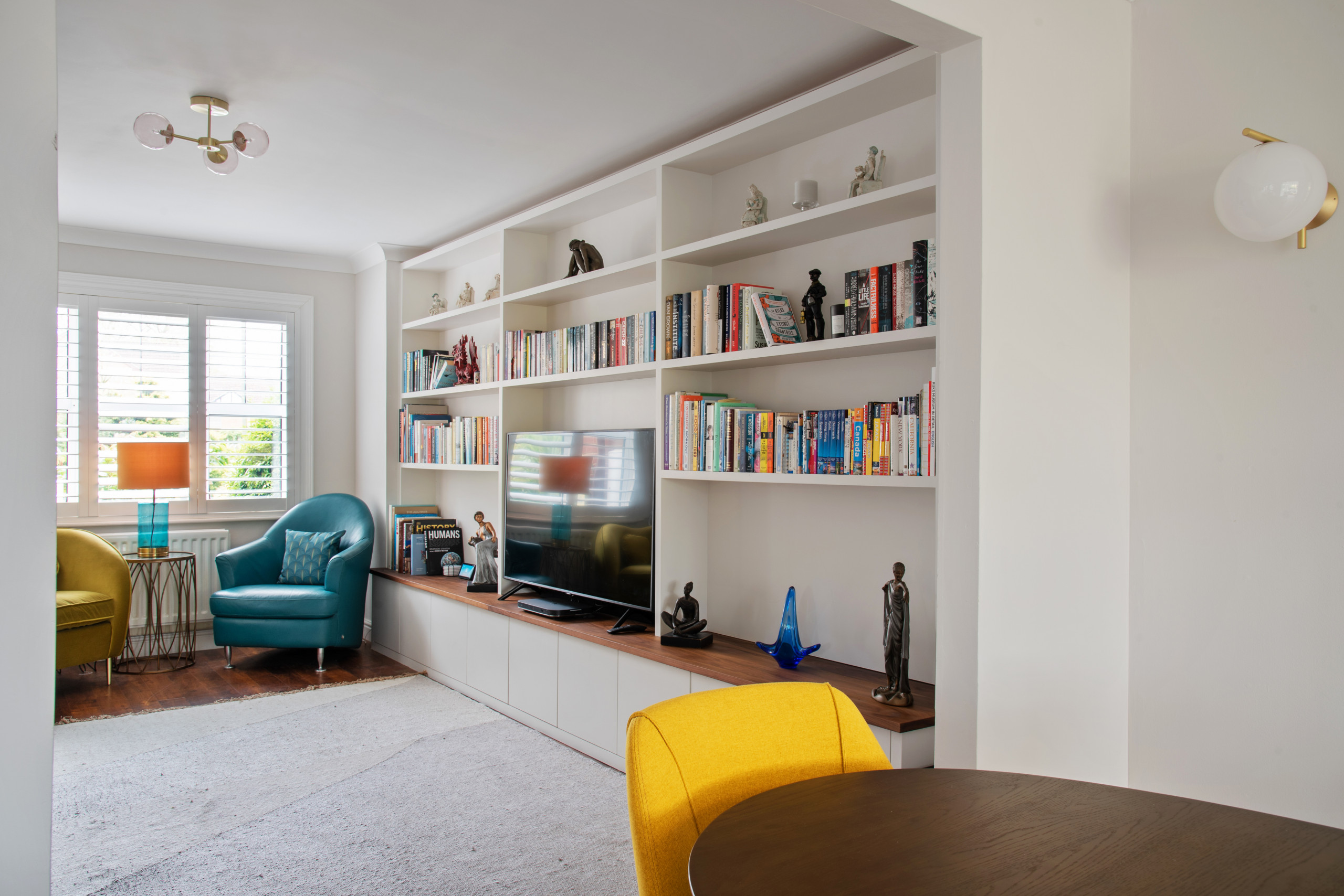 The living room also benefits from the extra light. There were tall bookcases in here previously, but they were a little overpowering, so Mia suggested this neat wall of built-in joinery.