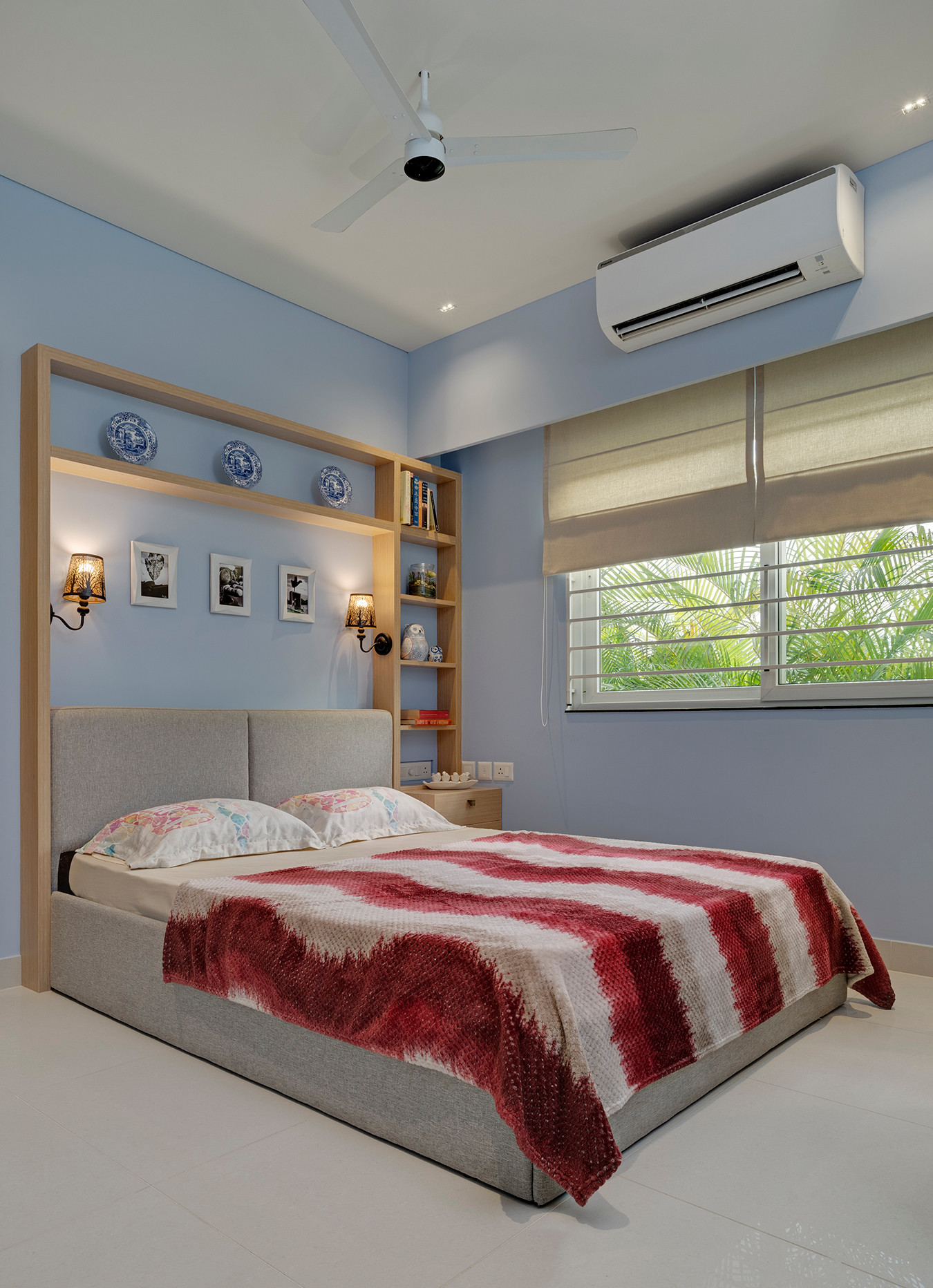 Next to the master bedroom is the guest bedroom. Here, the oak-wood headboard anchors the bed and extends to form the framework for shelves. Awash in pastel blues, the walls create a cool and refreshing interior.