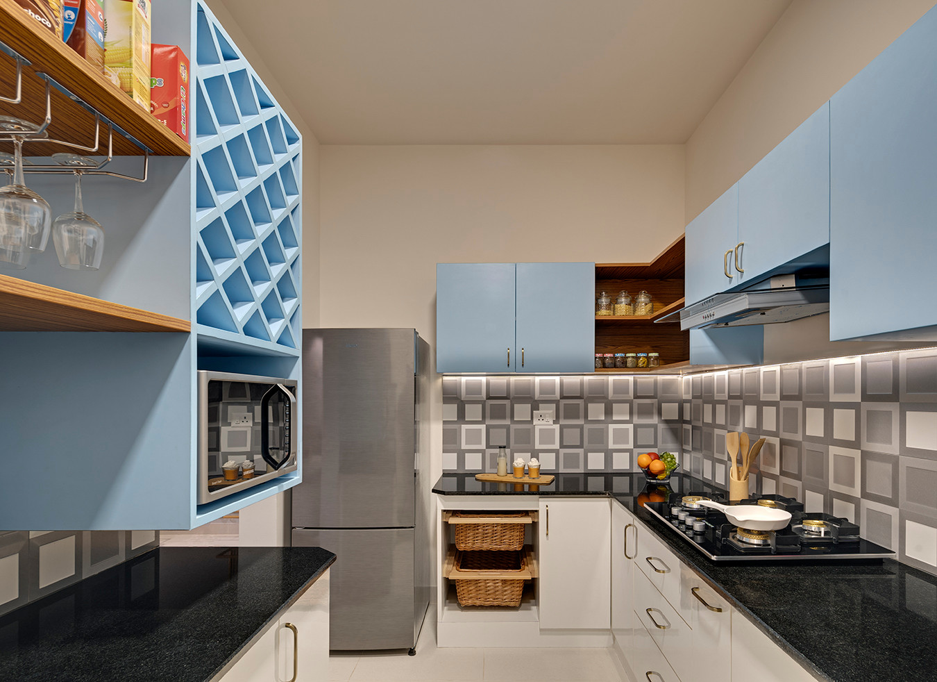 Geometric backsplashes and azure cabinetry enliven the neutral colour palette of this kitchen. The designers have packed a punch with smart storage and carved out space for a home bar, too.