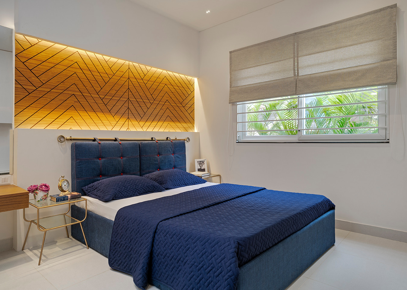 A corridor from the living area leads to the bedrooms. In the master bedroom, a chevron-patterned accent wall behind the bed commands attention. The denim headboard features button tufting and is mounted on a brass rail for a hint of bling. The side tables continue the subtle glitz of metal.