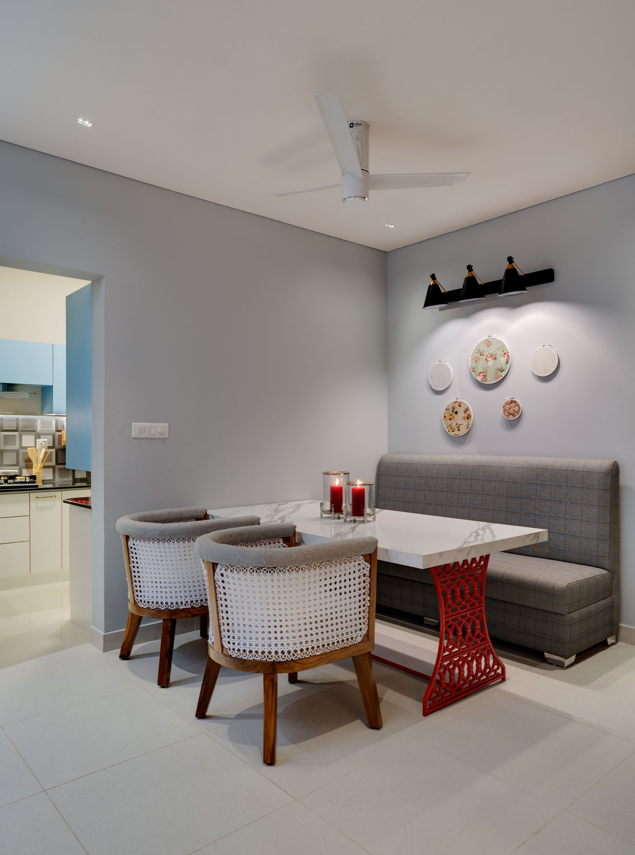 Tucked away in a corner for privacy, the dining area abuts a semi-open kitchen. The dining table has a Statuario marble tabletop resting on a red wrought-iron lattice base. A muted grey sofa and chairs with woven vinyl backs contribute subtly to the colour scheme, creating an inviting ambience.