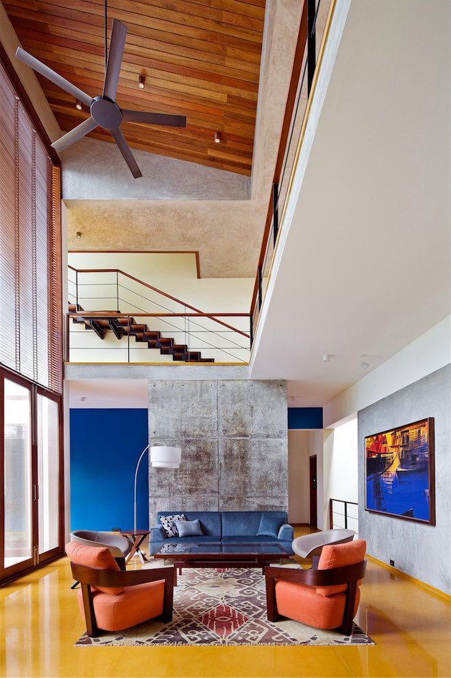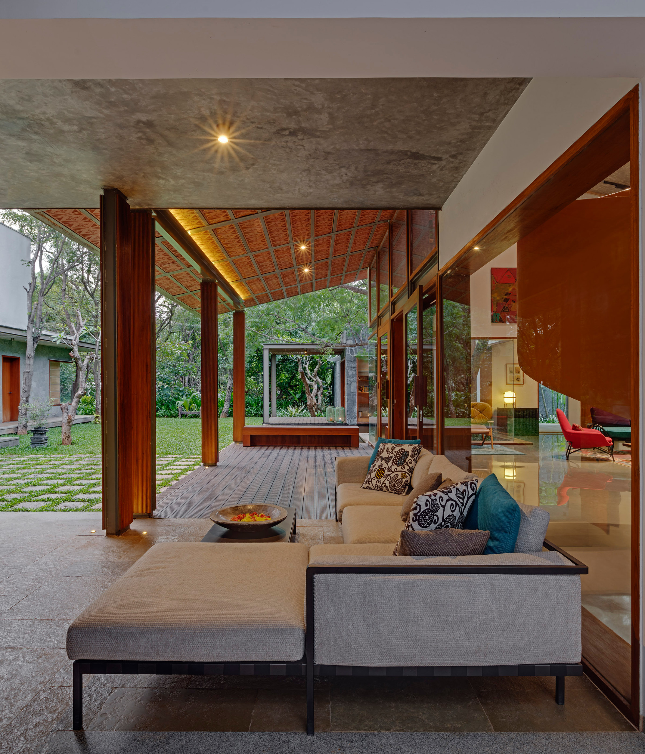 In this living space created by Manasaram Architects, a drawing room and other areas are placed around a two-level courtyard for ventilation. Pull-down screens, like those seen on either side, can be used to offer protection from excessive heat or glare whenever needed.