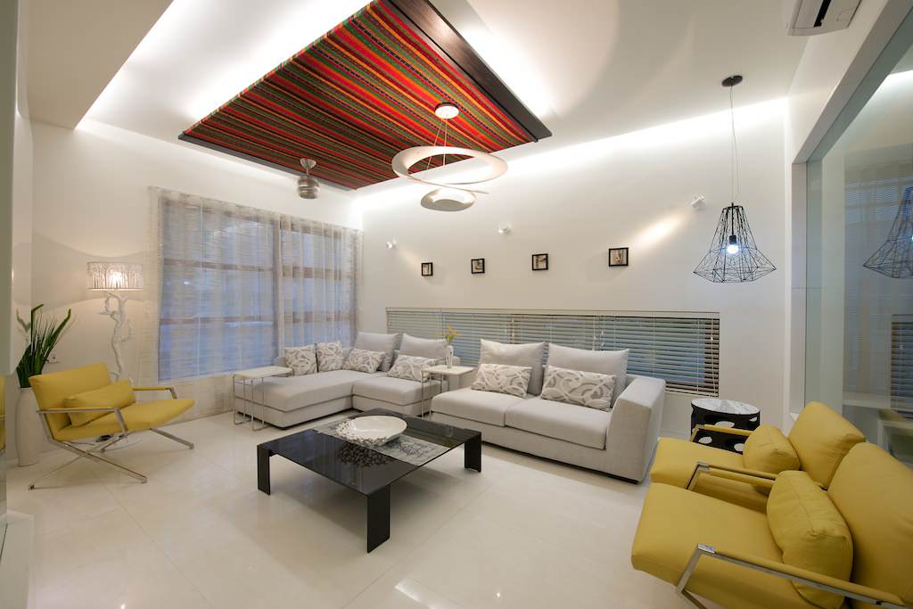 Don’t be afraid to go for brightly coloured upholstery. Adding patterned and contrasting cushions can also add colour, layers and texture to the living space. Whenever you get bored with the look – all you have to do is change the cushions! In this living room, the green and the pink of the sofas work well with the floral patterns on the third seat, and complements the faux ceiling’s colours too.