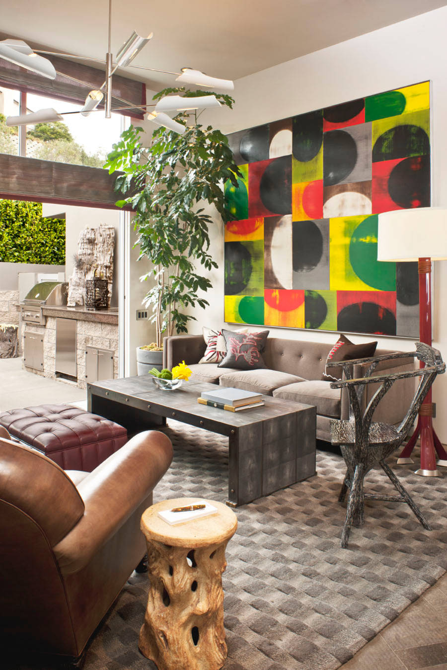 A single painting in bright hues can bring in all the colour you need into your drawing room. Like in this space, the muted greys and browns are a perfect backdrop for the multi-coloured painting that not only acts like the accent feature of the room but also makes good use of the tall ceiling height.